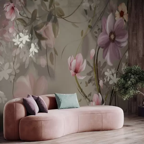 Fototapeten Rosa und weiße Blumen mit braunen Stielen und Blättern, sanfte Beleuchtung, gedämpfte Farben, Blumenarrangement N° w09417