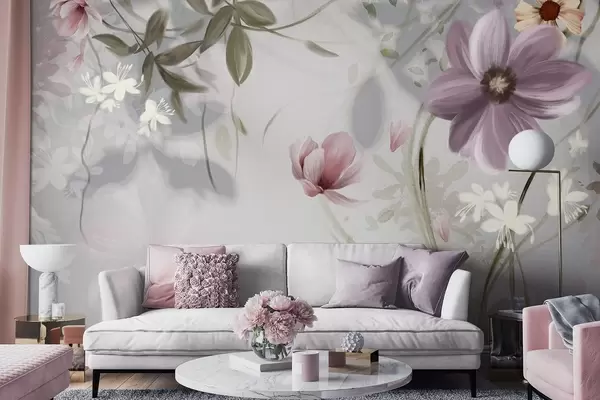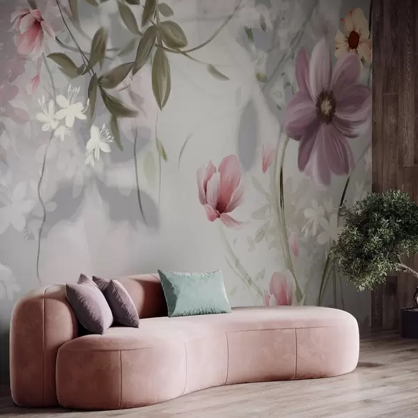 Fototapeten Rosa und weiße Blumen mit grünen Stielen und Blättern, sanfte Beleuchtung, gedämpfte Farben, Blumenarrangement N° w09417v1