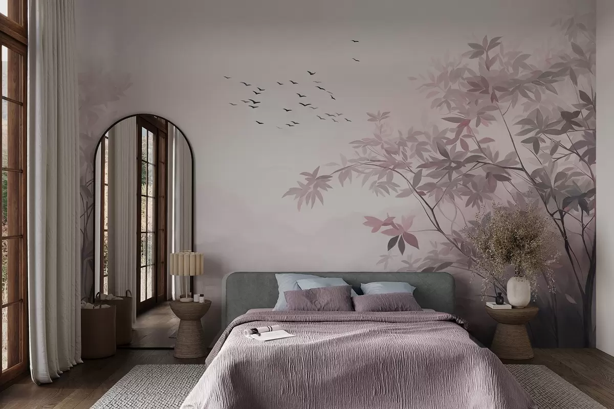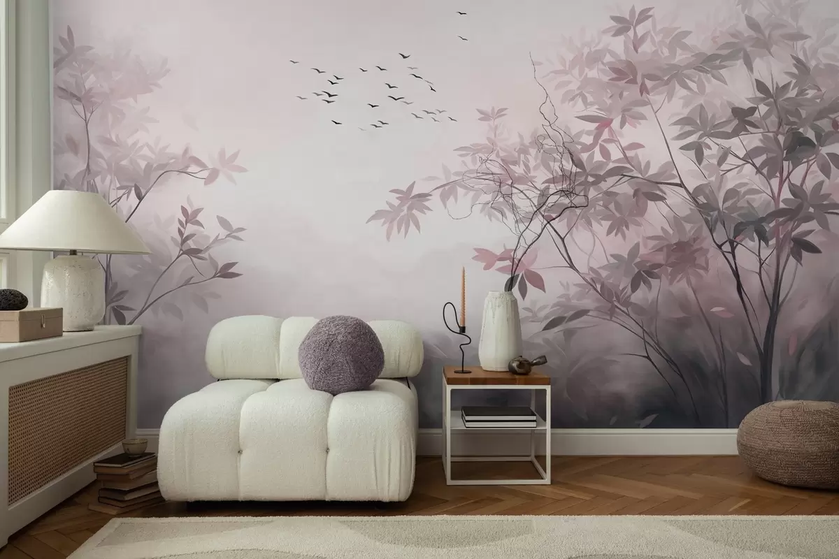 Fototapete Strukturierte Landschaft mit Bäumen und einem Vogelschwarm am Himmel, Pastellfarben, Naturszene w09418v1
