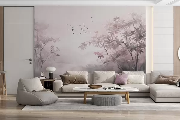 Fototapeten Strukturierte Landschaft mit Bäumen und einem Vogelschwarm am Himmel, Pastellfarben, Naturszene N° w09418v1