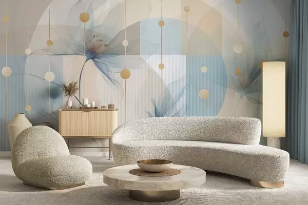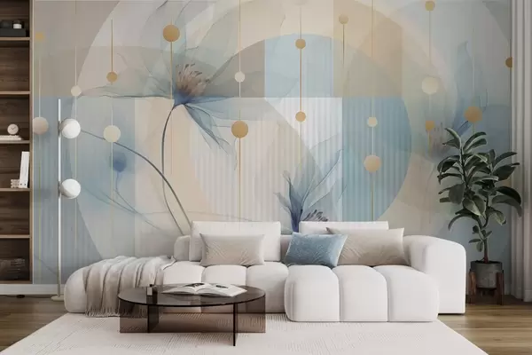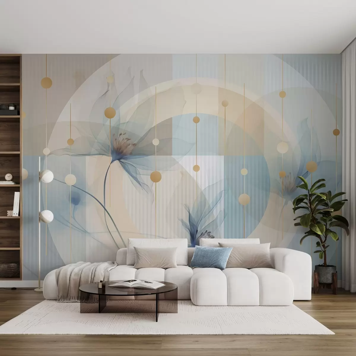 Fototapeten Abstrakte durchscheinende Blumen, Kreise und geometrische Formen, Pastellblau, Beige und Weiß als Farbpalette N° w09419