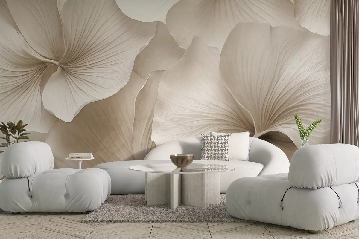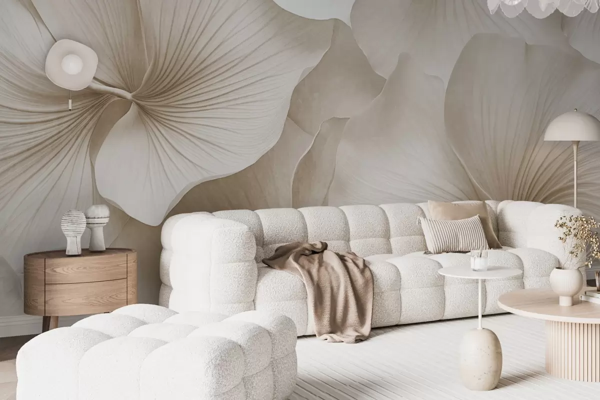 Fototapeten Weiße und beige Ginkgoblätter, weiche Textur, abstrakter Blumenhintergrund, minimalistischer moderner Stil N° w09421v1