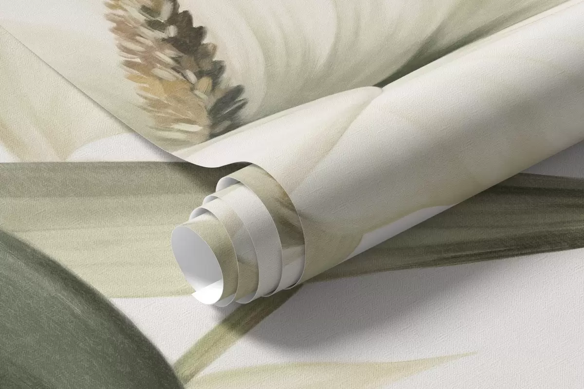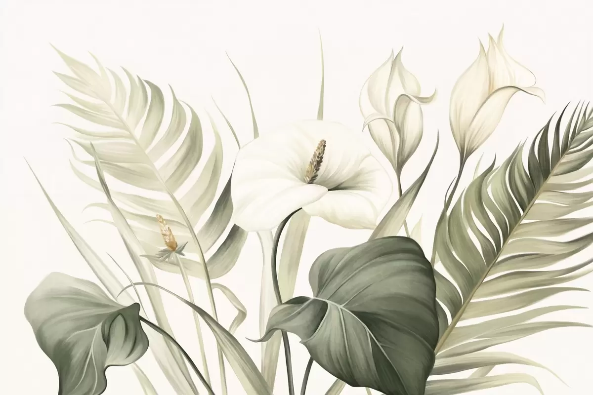 Fototapeten Weiße Callalilien und grüne tropische Blätter, botanische Illustration, heller Hintergrund, Vintage-Stil, strukturiert N° w09423