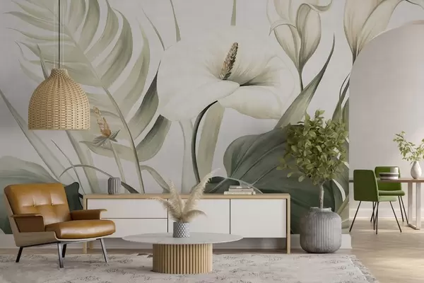 Fototapeten Weiße Callalilien und grüne tropische Blätter, botanische Illustration, heller Hintergrund, Vintage-Stil, strukturiert N° w09423