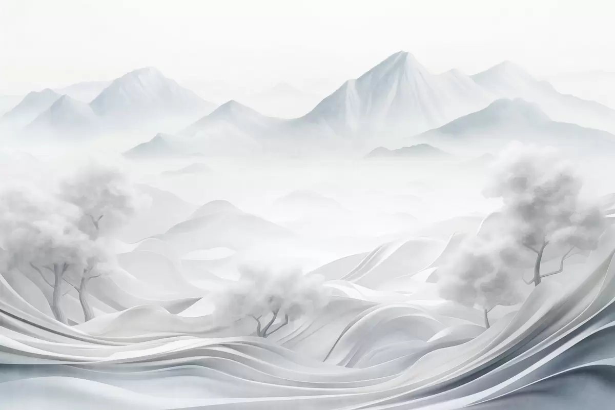 Fototapeten Verschneite abstrakte dekorative Berglandschaft mit weißen Bäumen und Nebel, minimalistischer strukturierter Stil N° w09426