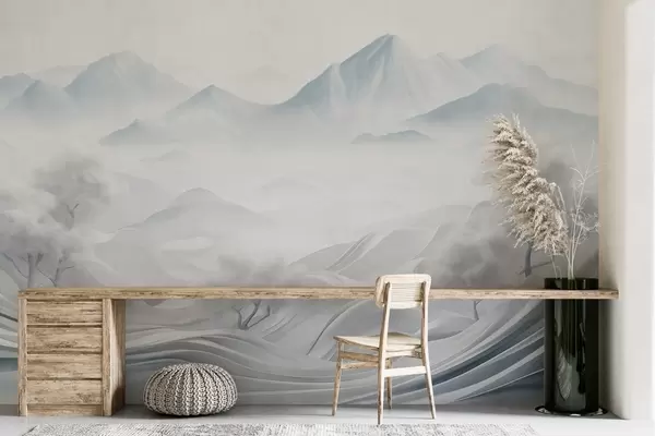 Fototapeten Verschneite abstrakte dekorative Berglandschaft mit weißen Bäumen und Nebel, minimalistischer strukturierter Stil N° w09426