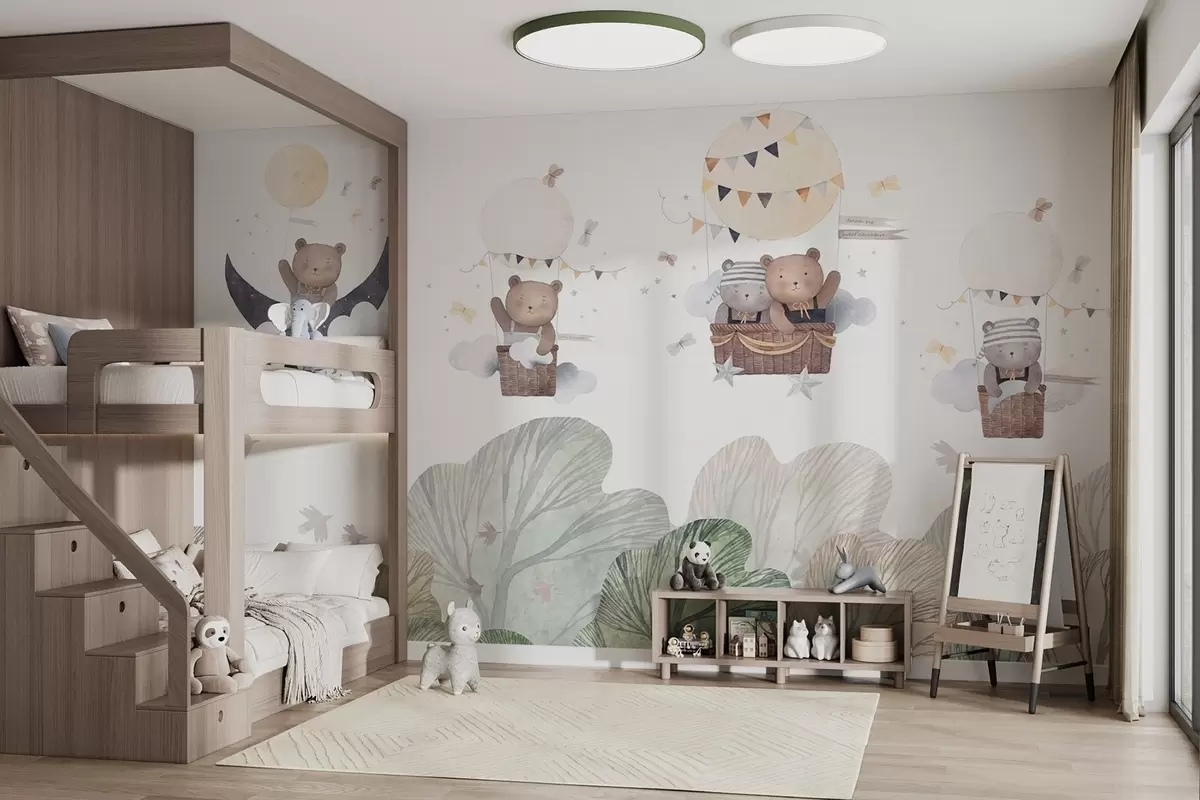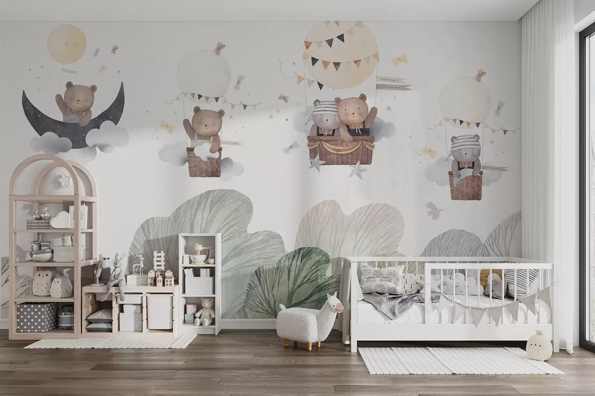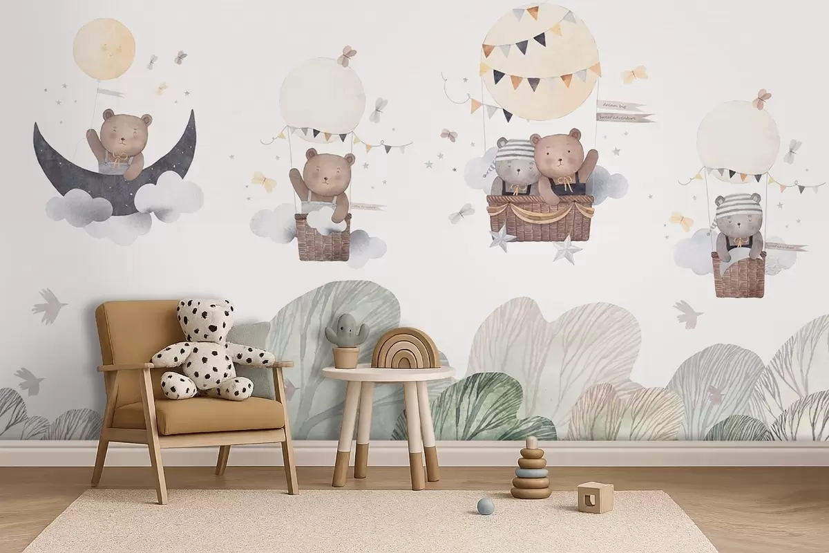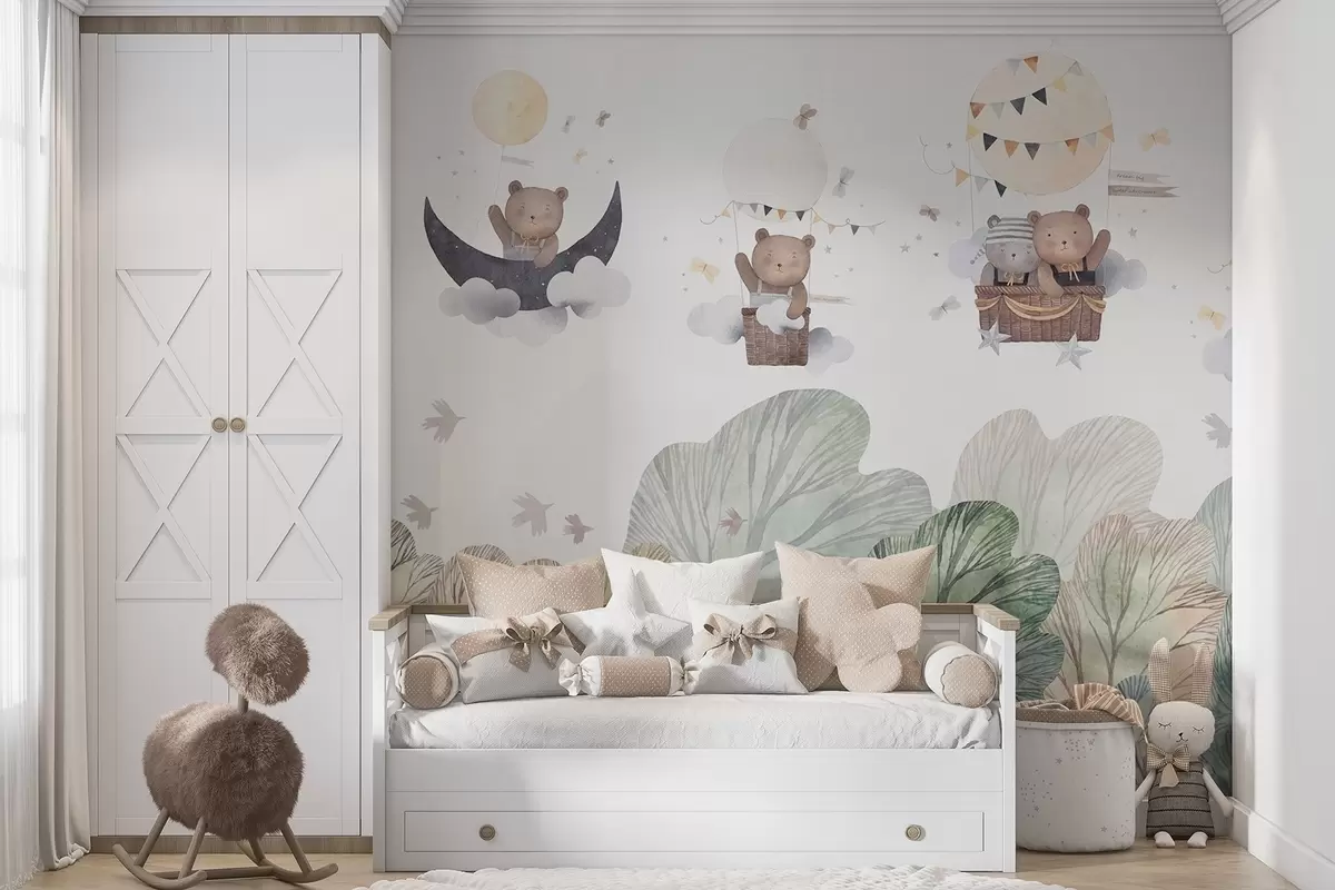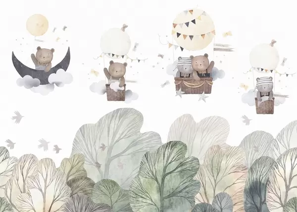 Fototapeten Aquarellartige Luftballons mit Bären über dem Wald N° w09437