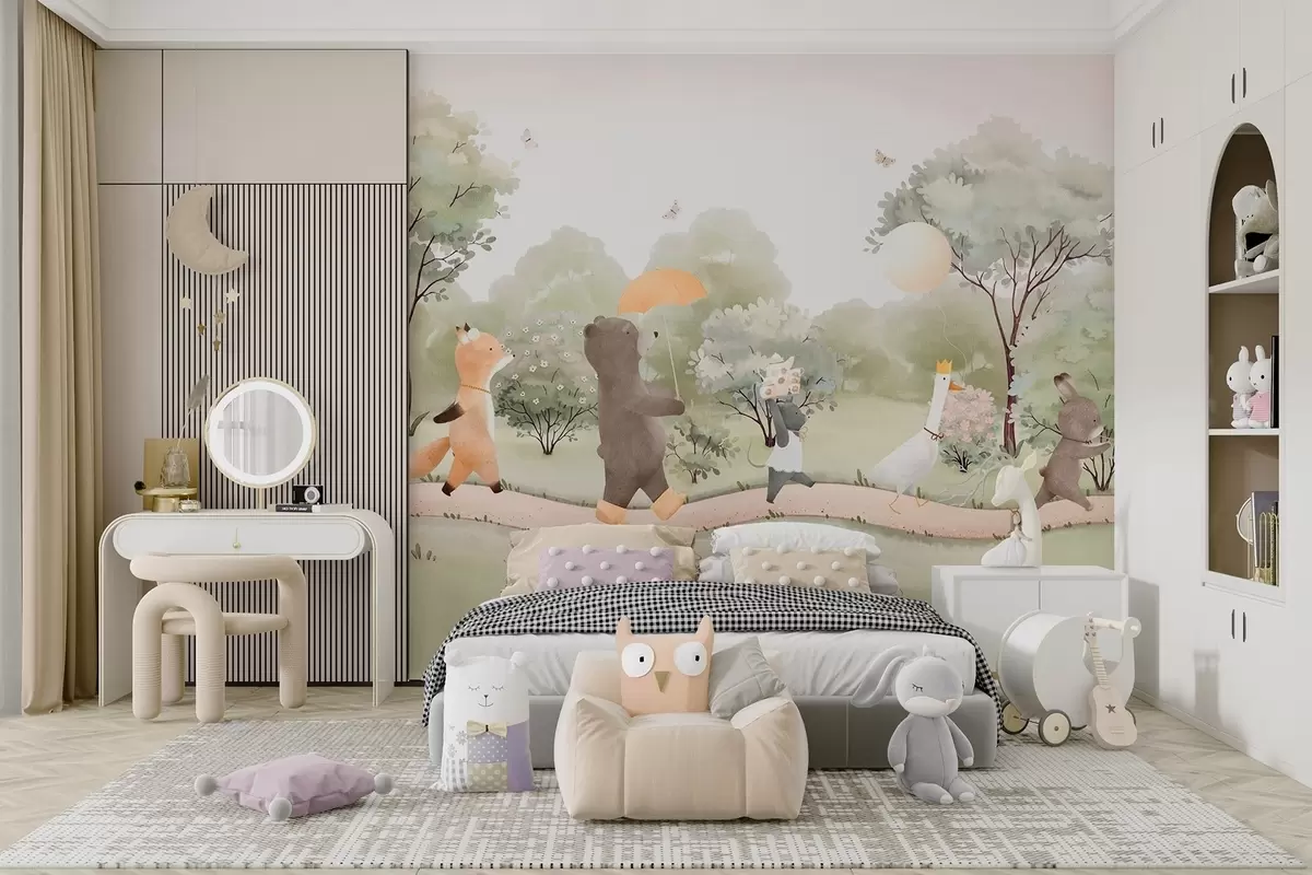 Fototapeten Festliche Reise kleiner Tiere durch den Wald im Aquarellstil N° w09440