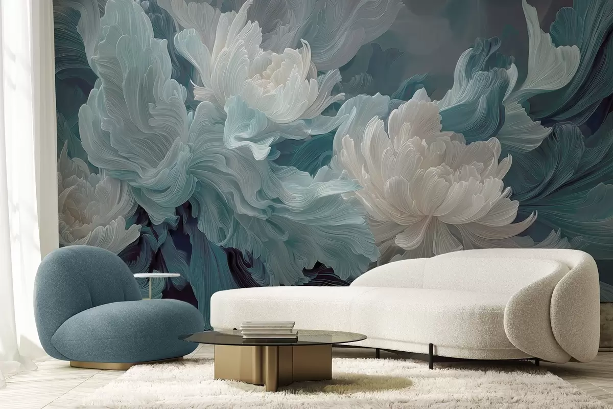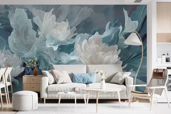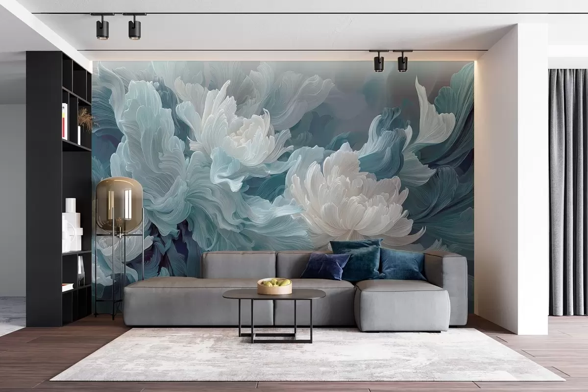 Fototapeten Abstrakte Blumen in Blau- und Türkistönen N° w09452