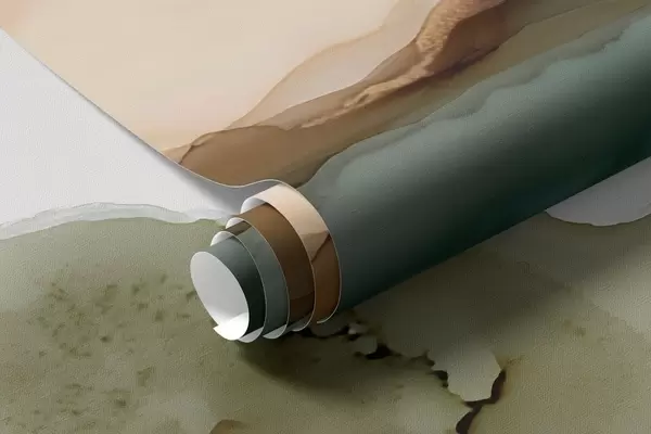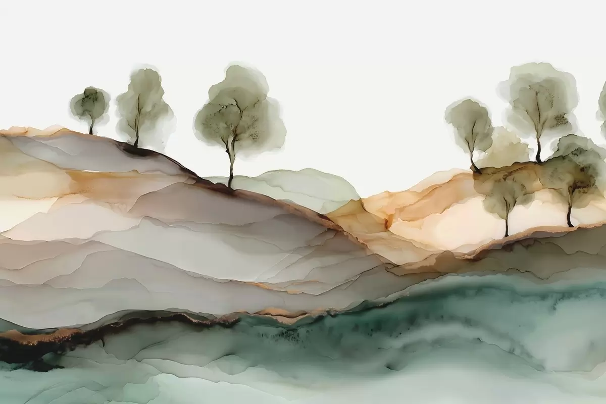 Fototapeten Abstrakte Landschaft im Alkohol-Tinten-Stil – Hügel und Bäume in Pastelltönen N° w09457