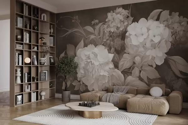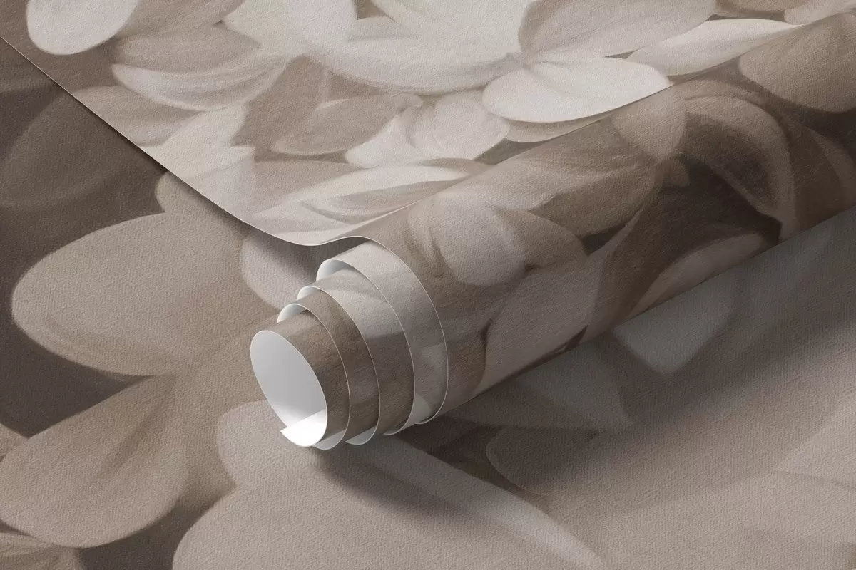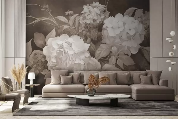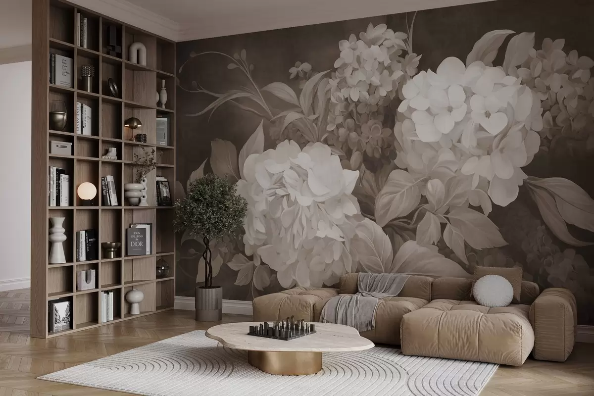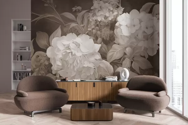 Fototapete Strukturierte Sepia-Malerei-Imitation von Hortensienblüten mit großen Blättern, abstraktem und dunklem Hintergrund w09465