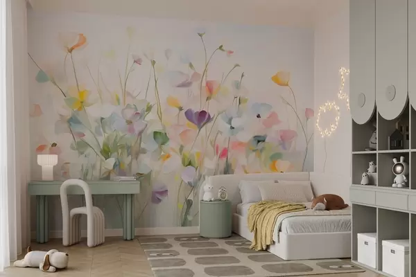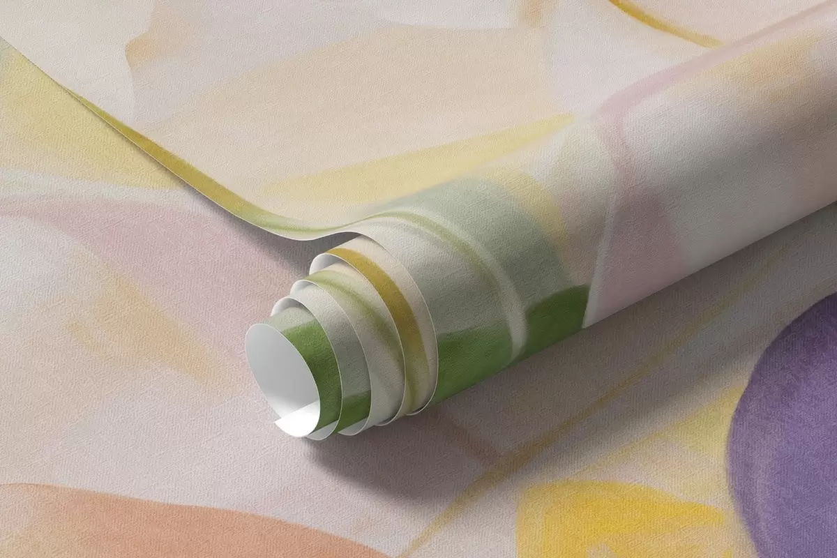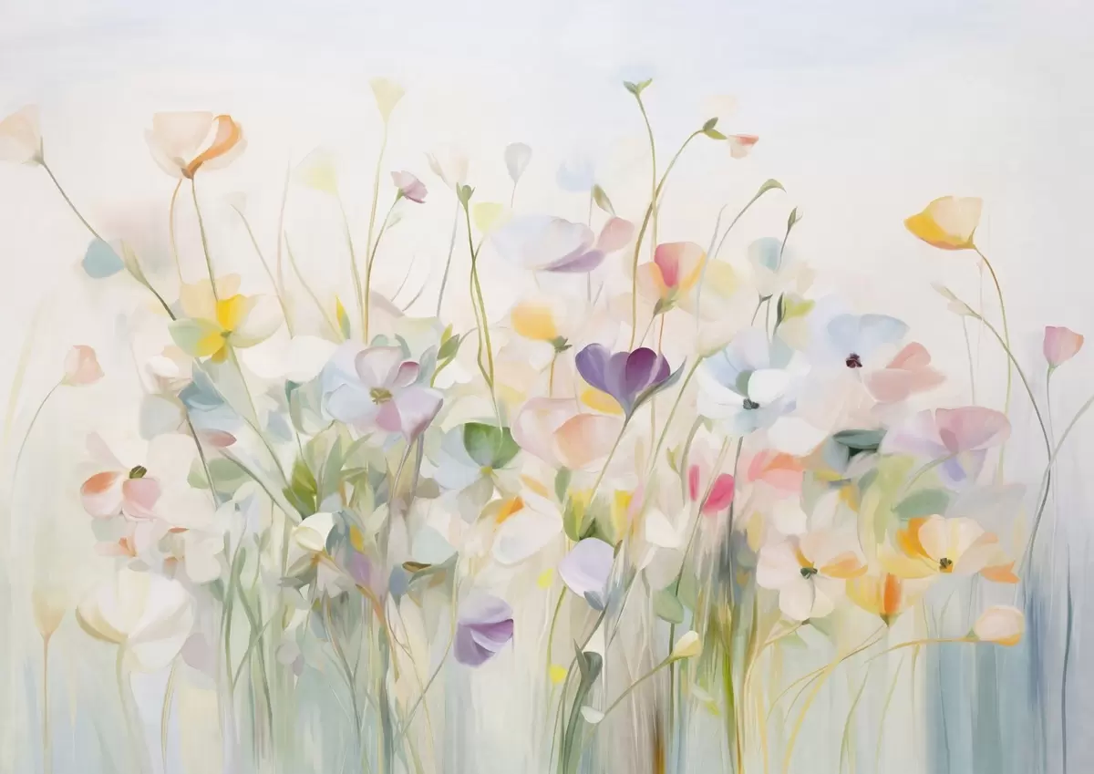 Fototapeten Abstraktes Feld mit bunten Blumen mit langen Stielen und grünen Blättern, strukturiert, pastellfarben, helle Farben N° w09466
