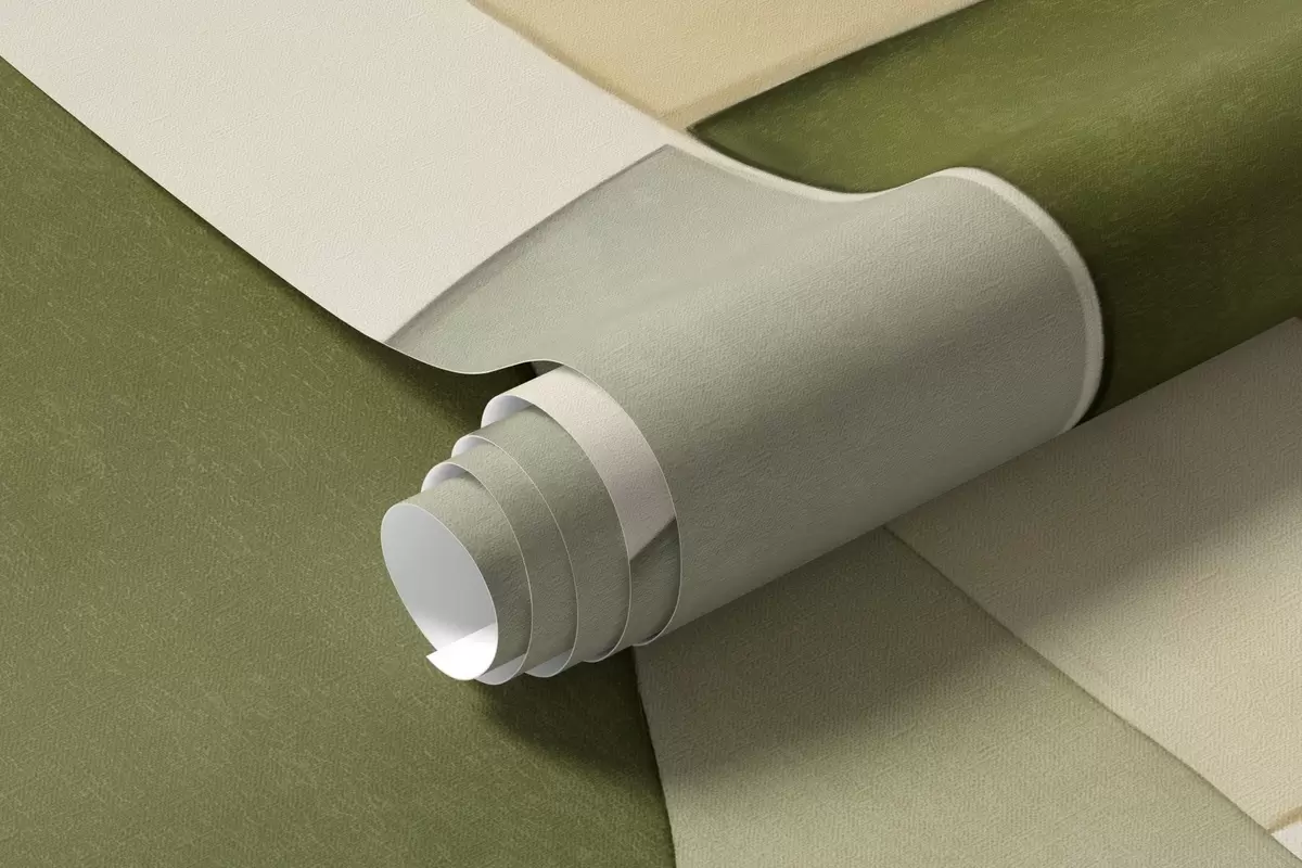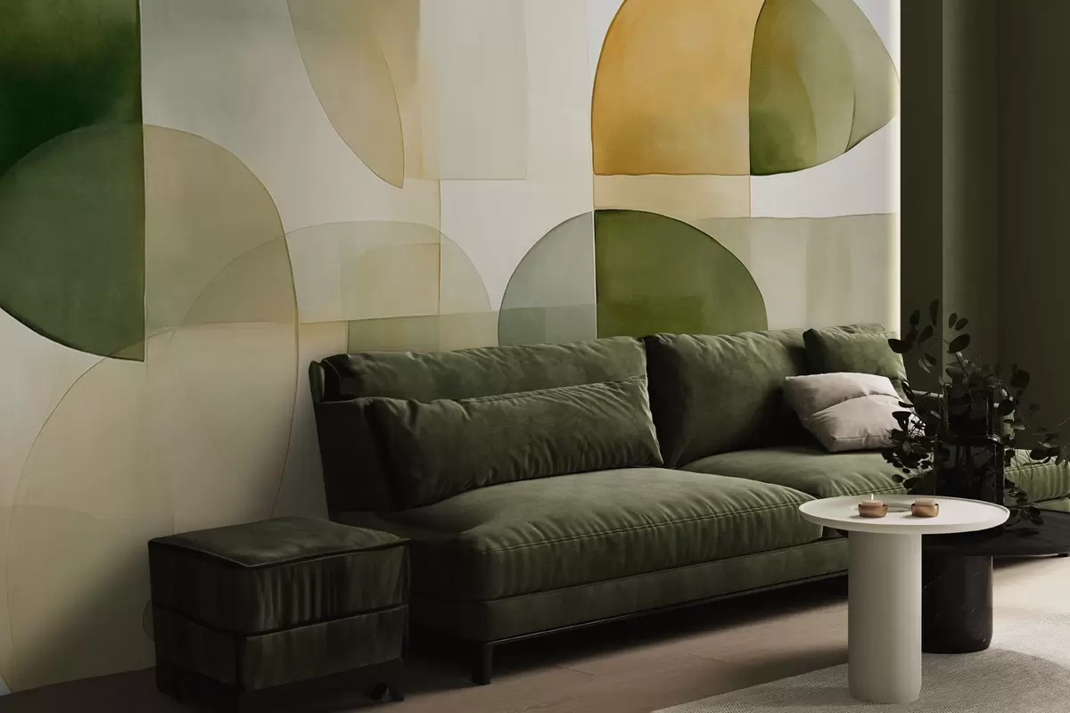 Fototapeten Abstrakte, strukturierte Formen in Grün- und Gelbtönen, gedeckte Farben, minimalistische Komposition, neutraler Hintergrund N° w09467