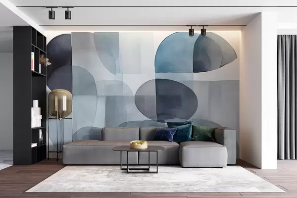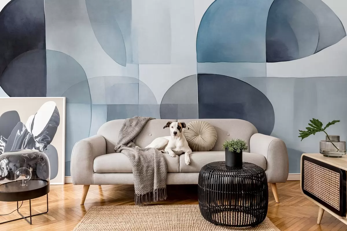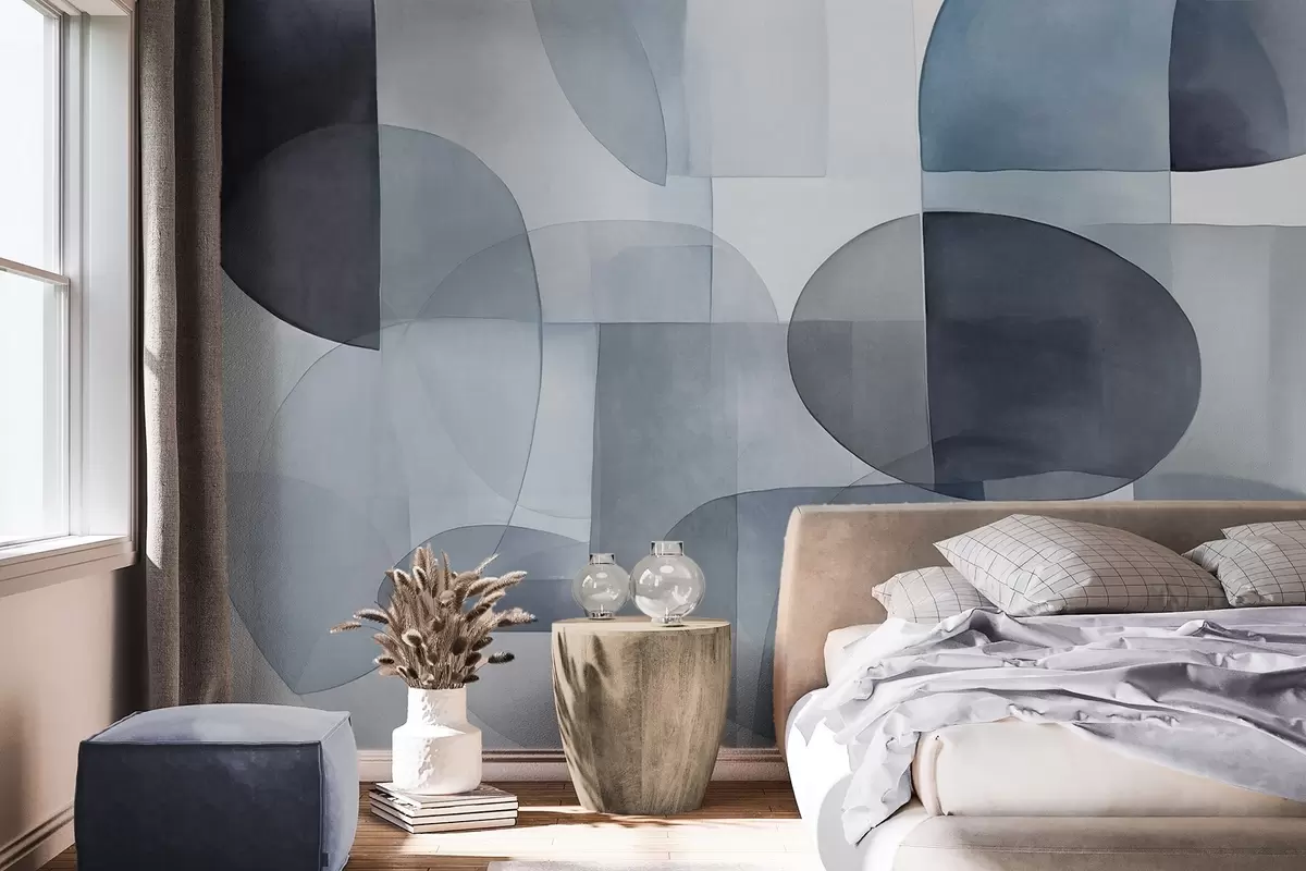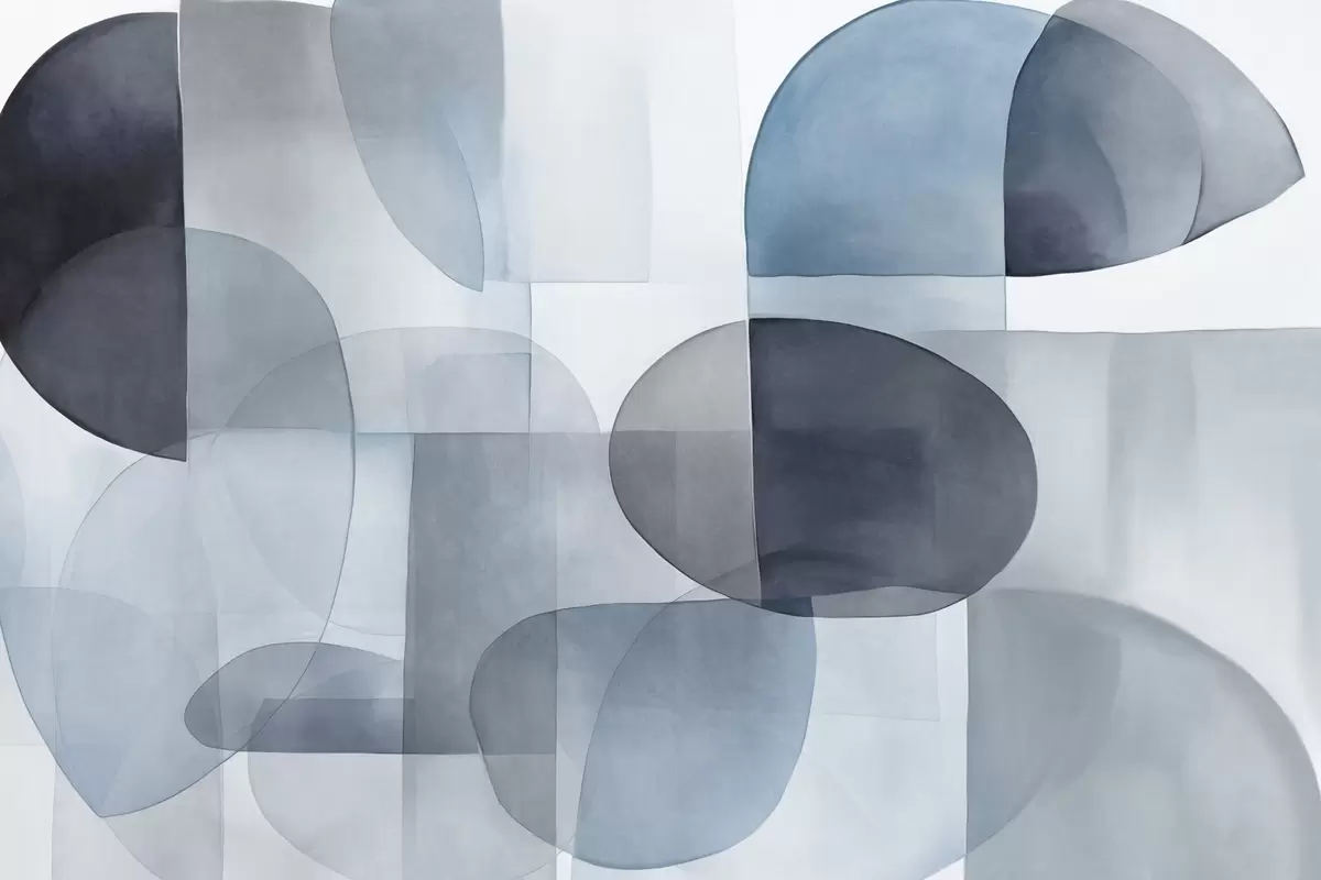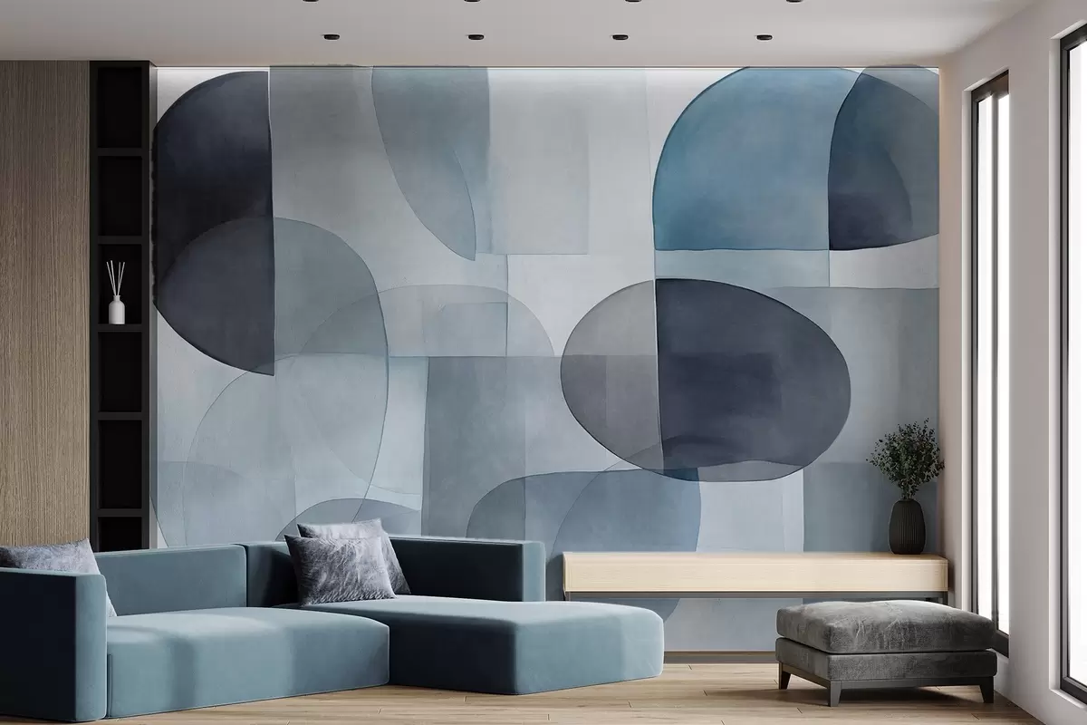 Fototapeten Abstrakte, strukturierte Formen in Grau- und Blautönen, gedeckte Farben, minimalistische Komposition, neutraler Hintergrund N° w09467v1