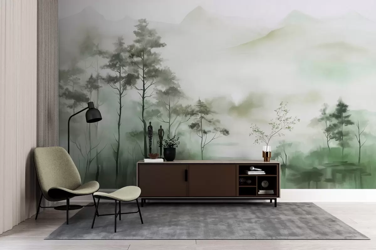 Fototapeten Neblige Landschaft mit hohen Bäumen und Bergen in gedämpften Grün- und Grautönen, minimalistischer Stil, strukturiert N° w09469