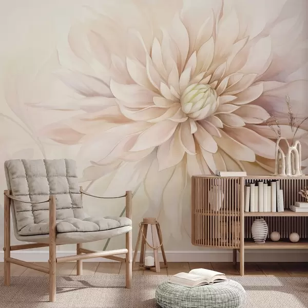 Fototapeten Eine hellrosa Dahlienblüte mit vielen Blütenblättern, weicher Pastellhintergrund mit einem Hauch von Grün und Beige N° w09470