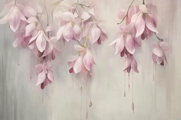 Fototapeten Hängende rosa Blumen, hellgrauer Hintergrund, florales Arrangement mit Struktur, botanische Kunst, Pastellfarben N° w09471