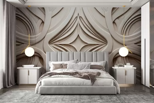 Fototapeten Abstrakter symmetrischer geometrischer Druck mit Struktur, hellbeige Farbe, Art-Déco-Stil, aufwendige Details N° w09473