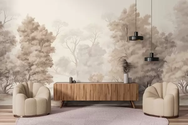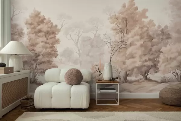 Fototapeten Strukturierte Landschaftsmalerei, die einen Wald mit hohen Bäumen und Gras imitiert, gedämpfte und sanfte Farben, beruhigende Szene N° w09474