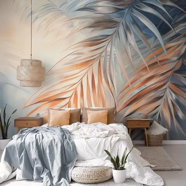 Fototapeten Palmenblätter in Orange- und Blautönen, heller strukturierter Hintergrund mit sanften Farben, eleganter tropischer Stil N° w09475