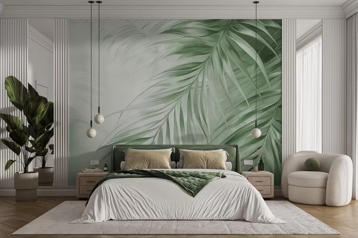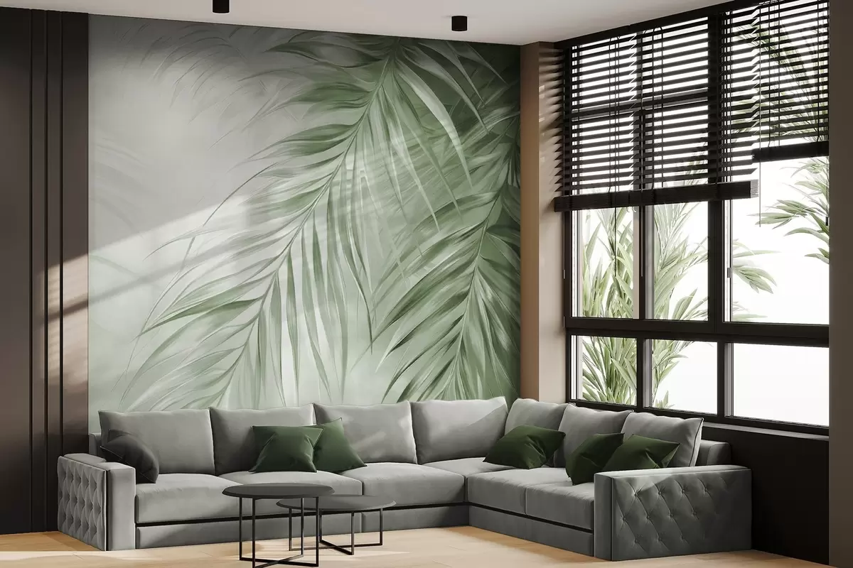 Fototapeten Palmblätter in Grüntönen, heller strukturierter Hintergrund mit sanften Farben, eleganter tropischer Stil N° w09475v2