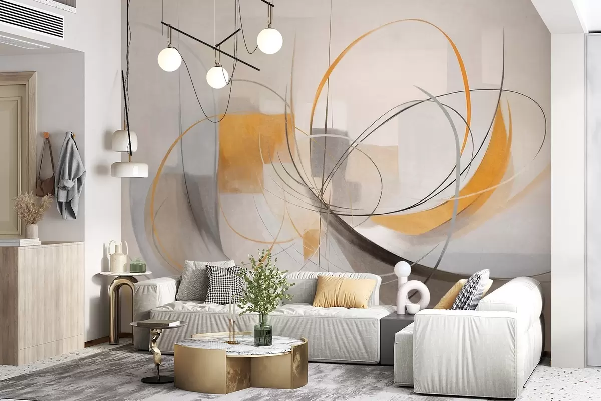 Fototapeten Abstrakter, strukturierter moderner Malstil mit geschwungenen Linien und geometrischen Formen in Grau-, Weiß- und Orangetönen N° w09476