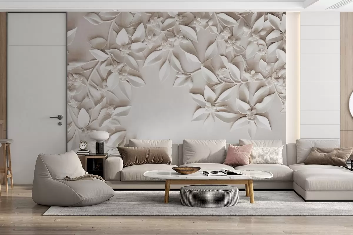 Fototapeten Weiße strukturierte Blumen und Blätter, Blumenarrangement, elegantes Design, minimalistischer Stil, dekorative Kunst N° w09479