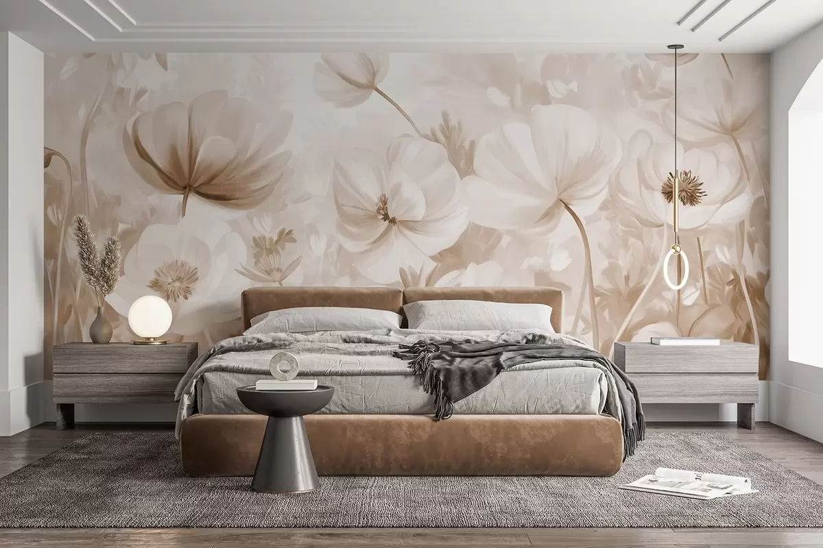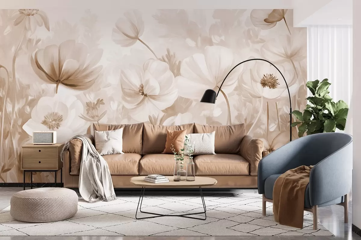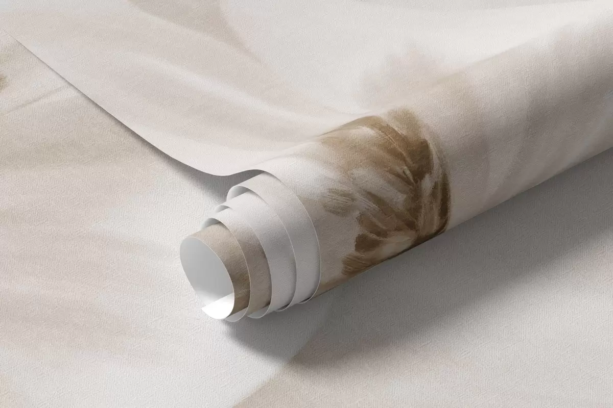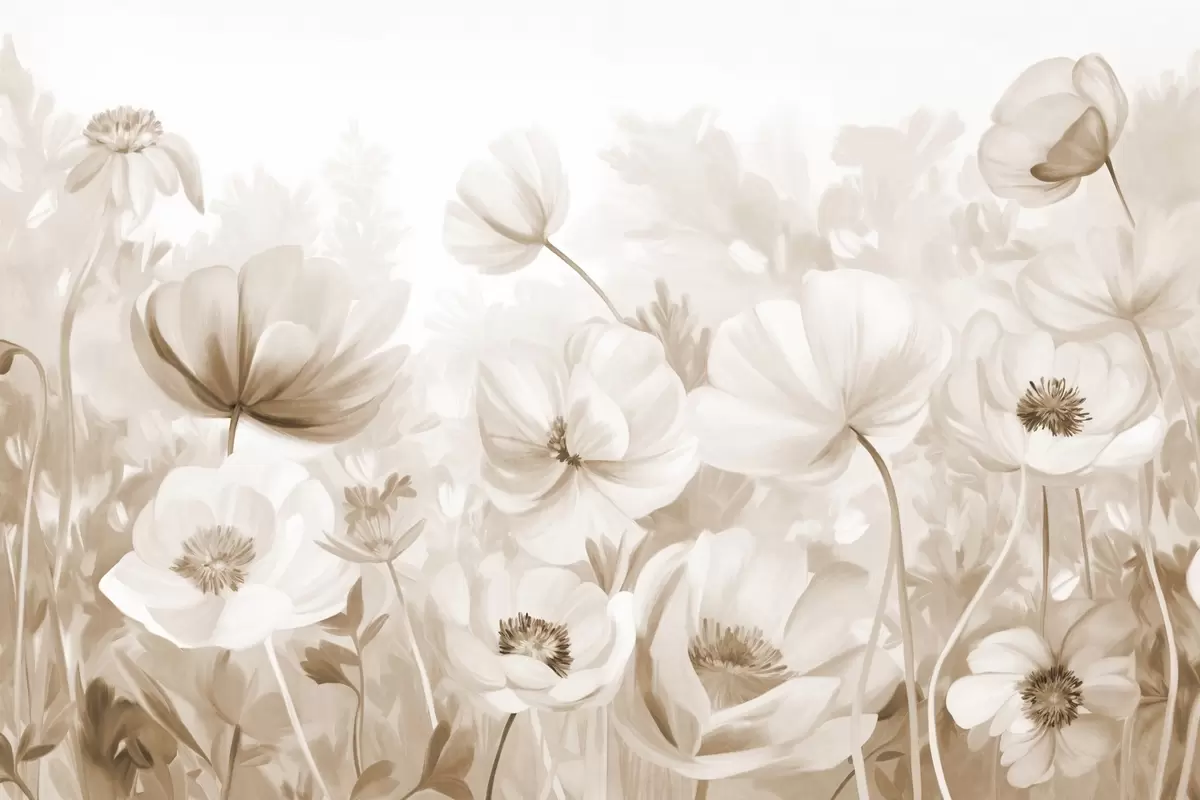 Fototapeten Ein Feld mit beigen Blumen mit zarten Blütenblättern und weichen braunen Blättern, in einem verträumten, strukturierten Aquarellstil N° w09481v1