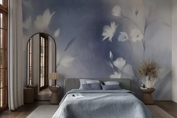 Fototapeten Weiße, strukturierte Blumen mit langen Stielen, zarte Knospen vor einem verschwommenen Hintergrund aus Blau- und Weißtönen N° w09484