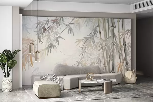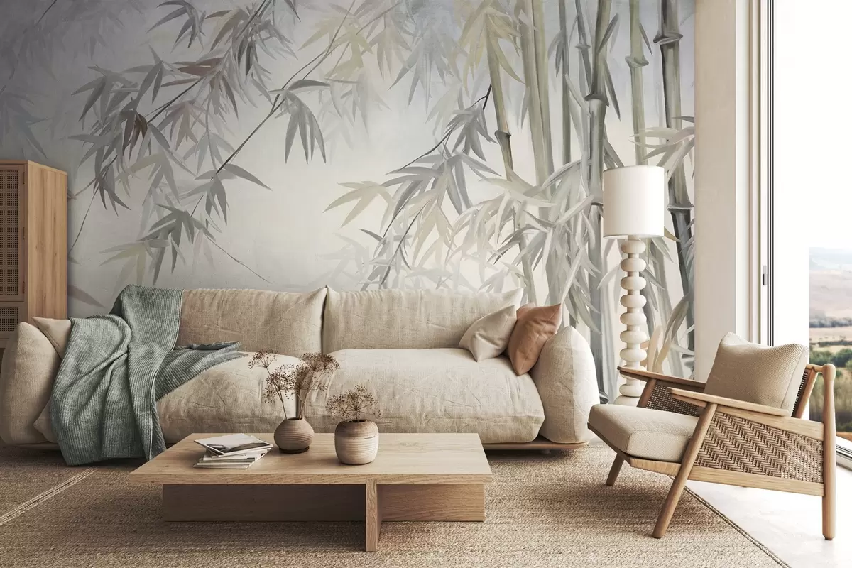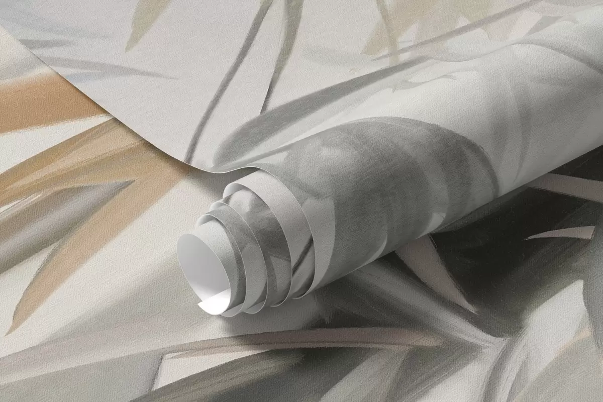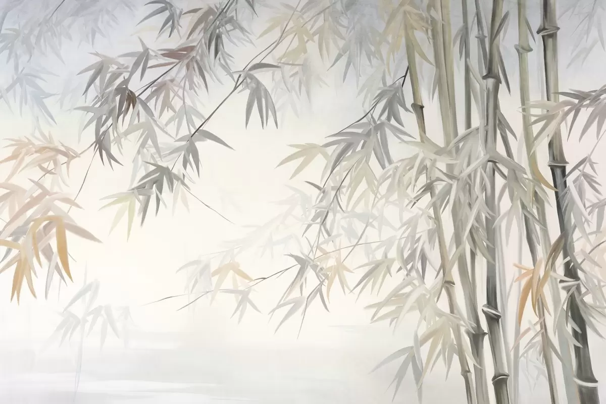 Fototapeten Strukturierte Bambusstämme und Blätter in einer sanften, gedeckten Farbpalette aus Grau, Weiß und Creme, minimalistische Komposition N° w09485