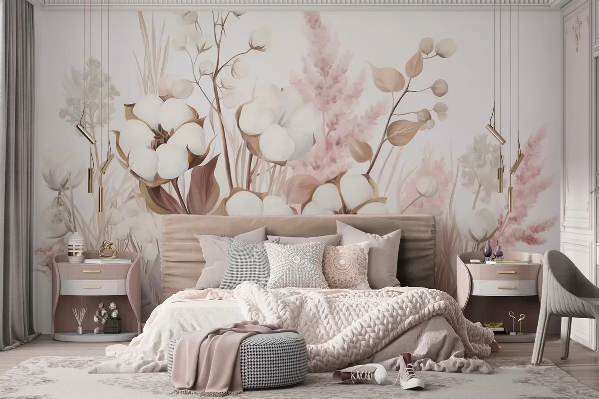 Fototapeten Baumwollblumen mit weißem und rosa Pampasgras, beigen und braunen Blättern und Kräutern, weißer Hintergrund N° w09489