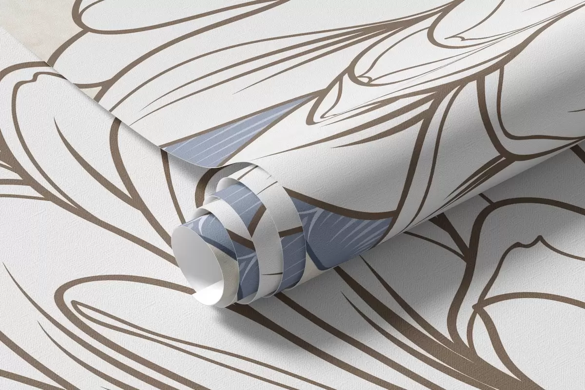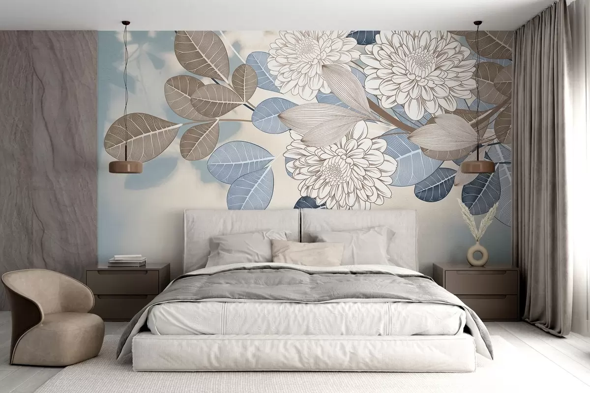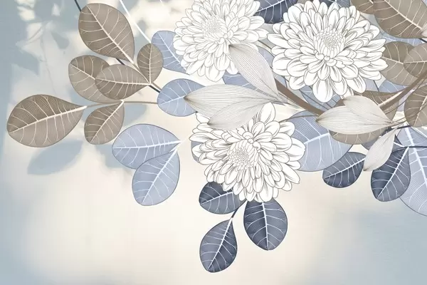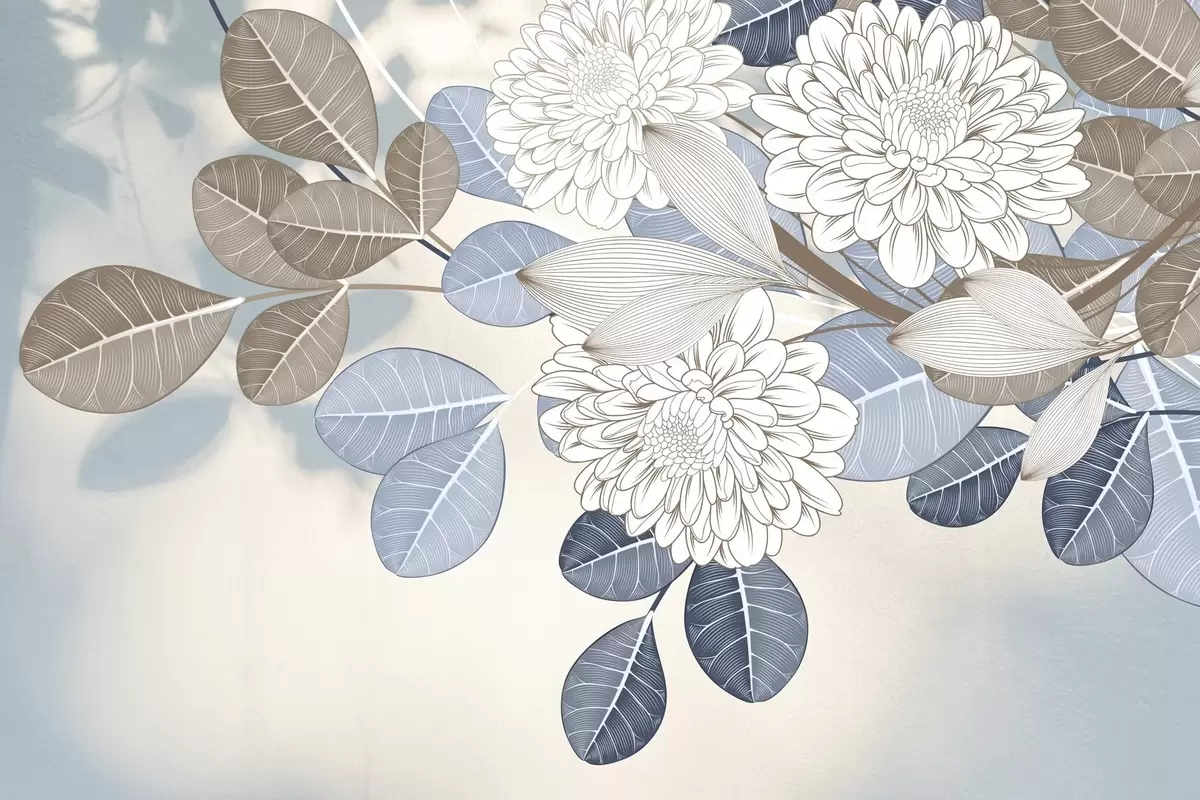 Fototapeten Weiße Blumen mit blauen und braunen Blättern, hellblauer strukturierter Hintergrund, Blumenarrangement, detaillierte Strichzeichnung N° w09496