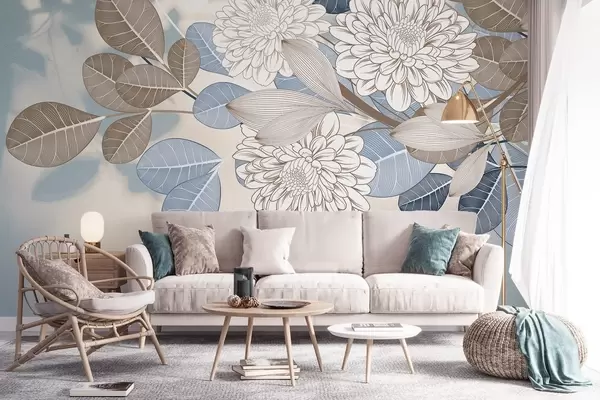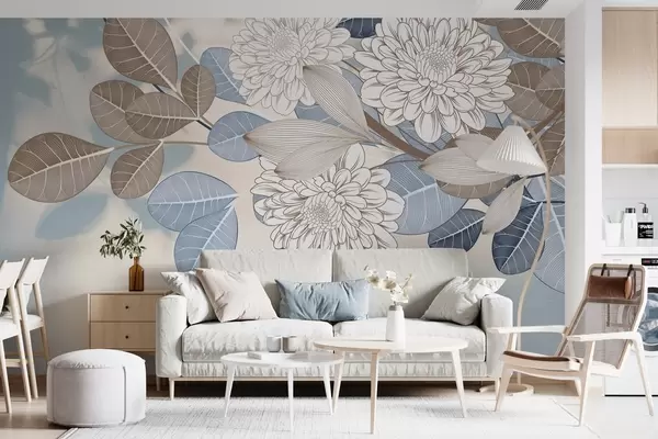 Fototapeten Weiße Blumen mit blauen und braunen Blättern, hellblauer strukturierter Hintergrund, Blumenarrangement, detaillierte Strichzeichnung N° w09496