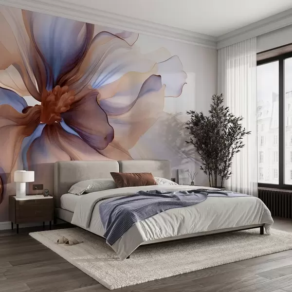 Fototapeten Detaillierte, großflächige Blume mit weißen, blauen und braunen Blütenblättern auf weißem Hintergrund N° w09498