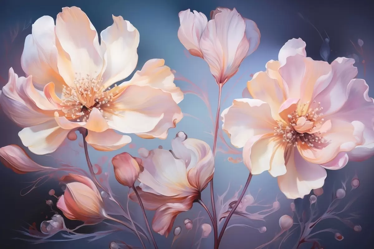 Fototapeten Luftige rosafarbene Pfingstrosen im Aquarellstil auf tiefblauem Hintergrund N° w09513