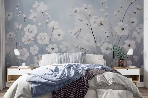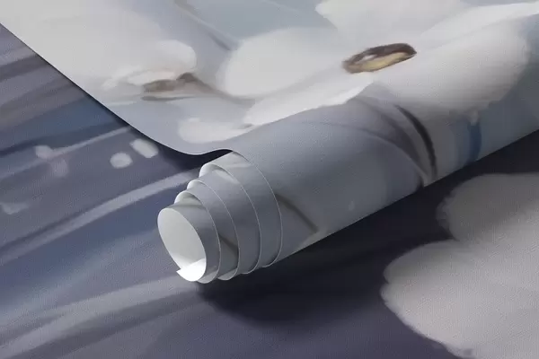 Fototapeten Weiße Blumen vor blauem Himmel im Ölgemälde-Stil N° w09516