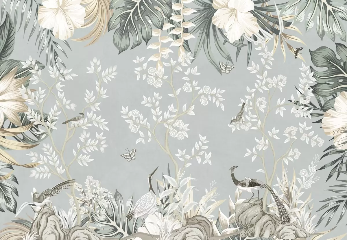 Fototapeten Tropische Pastellkunst mit Vögeln, Schmetterlingen, Hibiskusblüten, Palmblättern und Bäumen vor hellblauem Hintergrund N° w09528