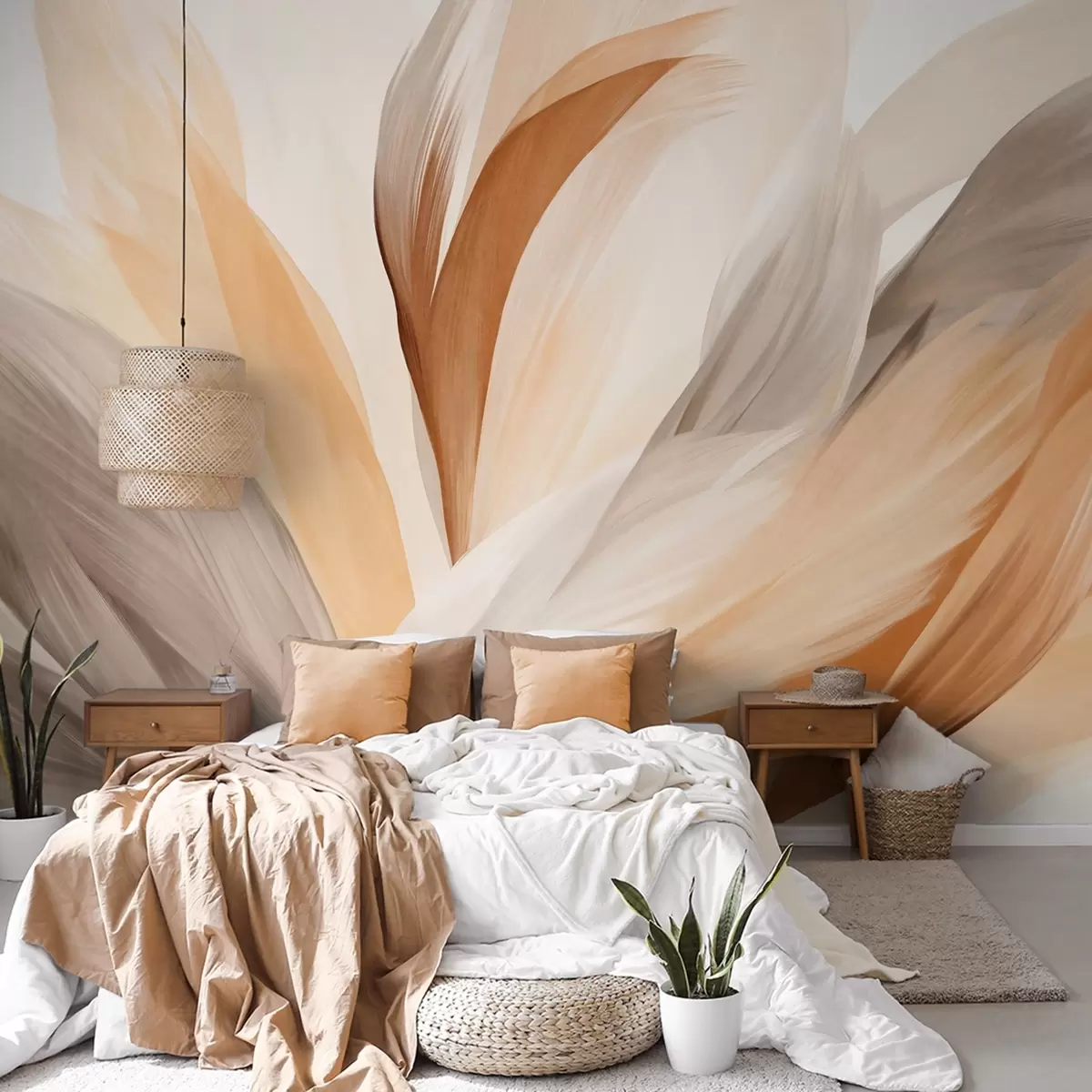 Fototapeten Abstrakte strukturierte Federn in Braun, Weiß und Grau sowie verschiedenen Farbtönen, die sich auf einem weißen Hintergrund überlagern N° w09531