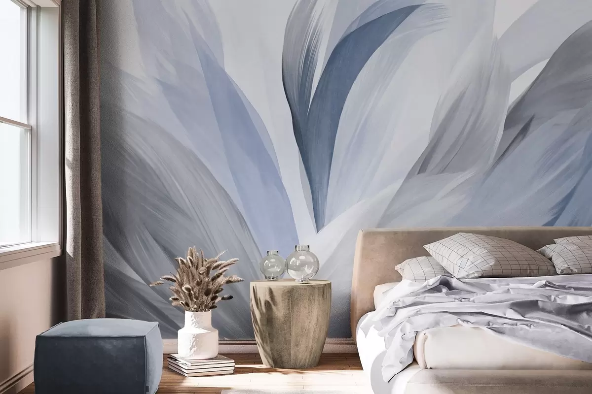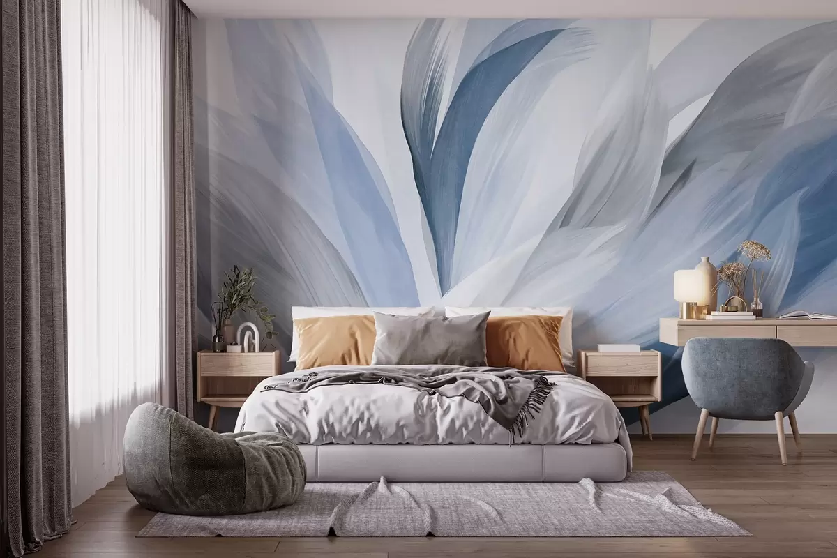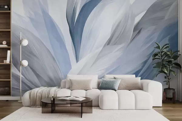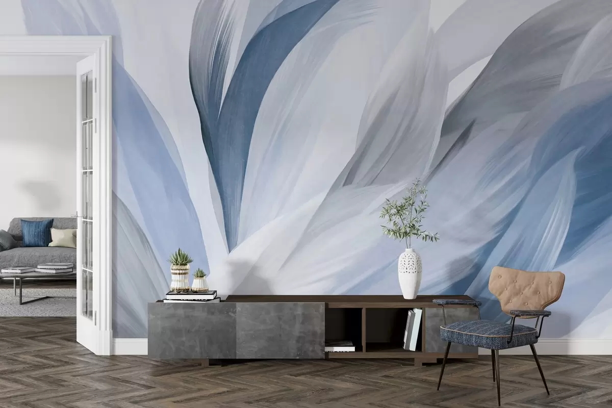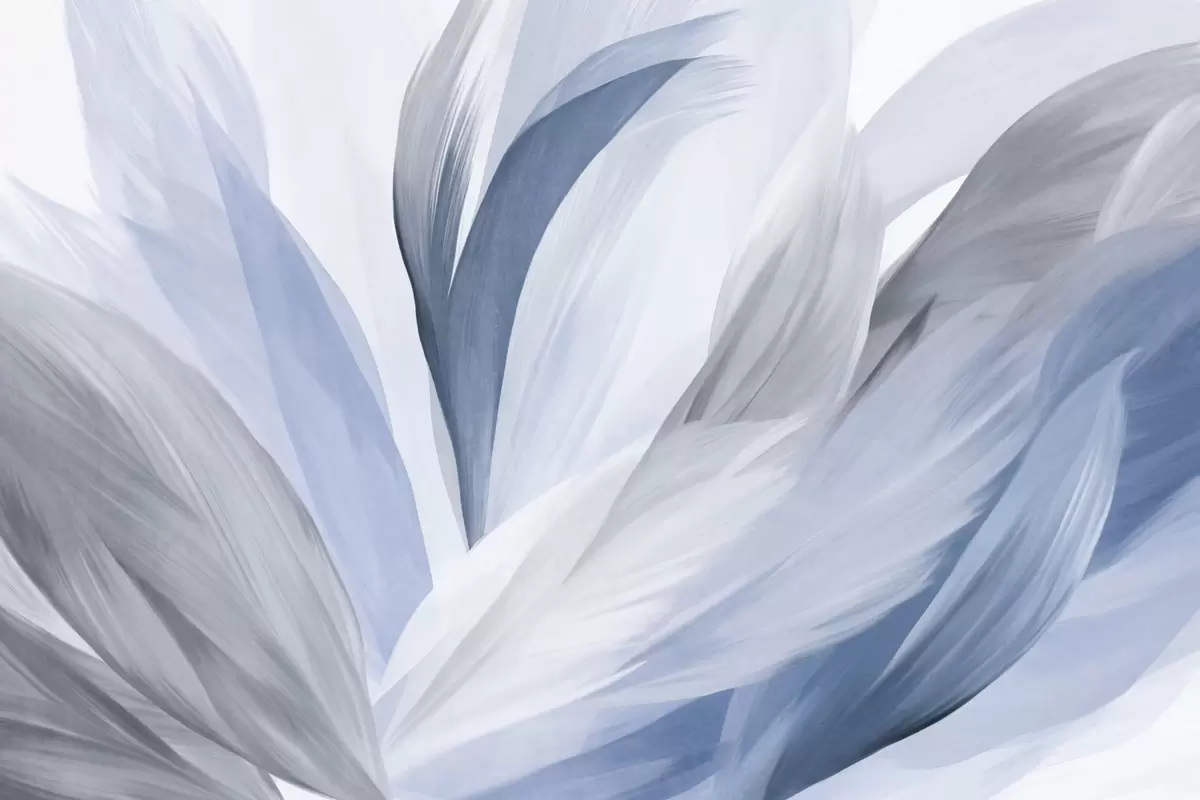 Fototapeten Abstrakte strukturierte Federn in Blau, Weiß und Grau sowie verschiedenen Farbtönen, die sich auf einem weißen Hintergrund überlagern N° w09531v1