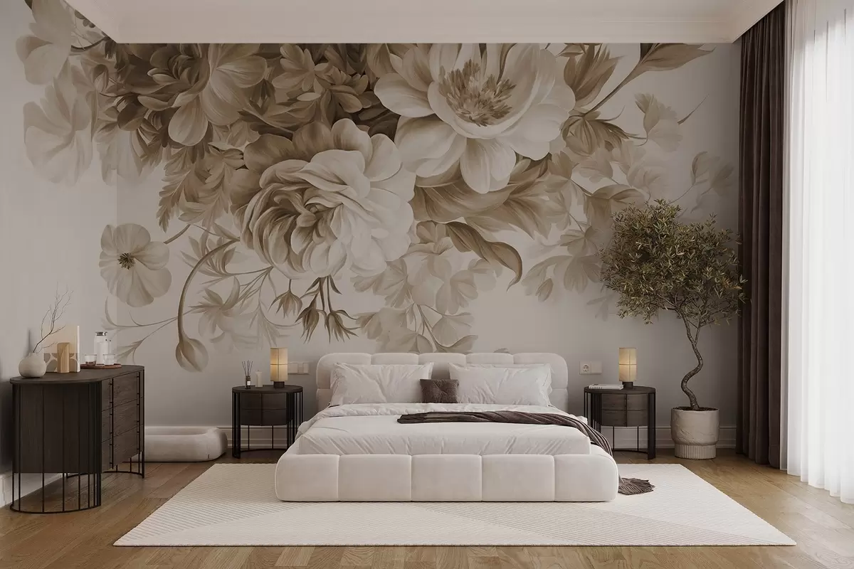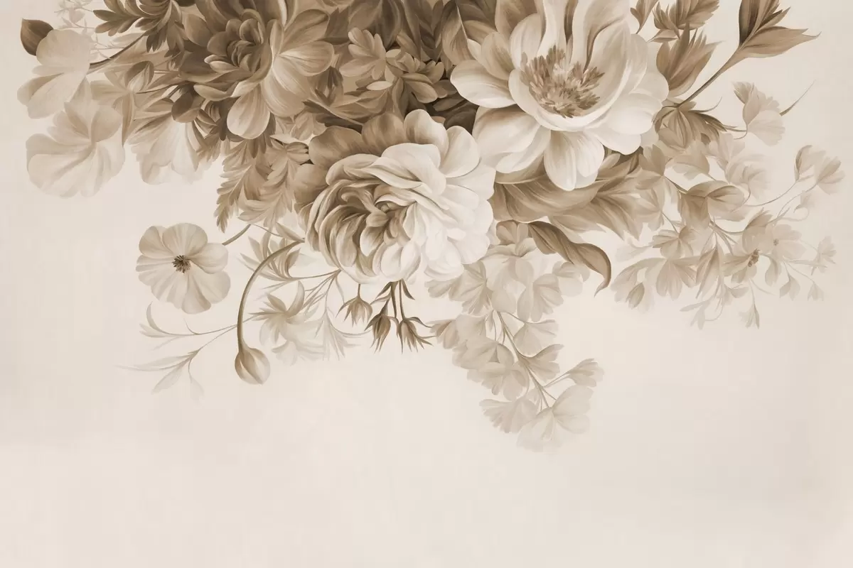 Fototapeten Vintage-Blumenarrangement mit Rosen, Pfingstrosen und anderen strukturierten Blumen mit Blattwerk auf hellem Hintergrund N° w09532v1