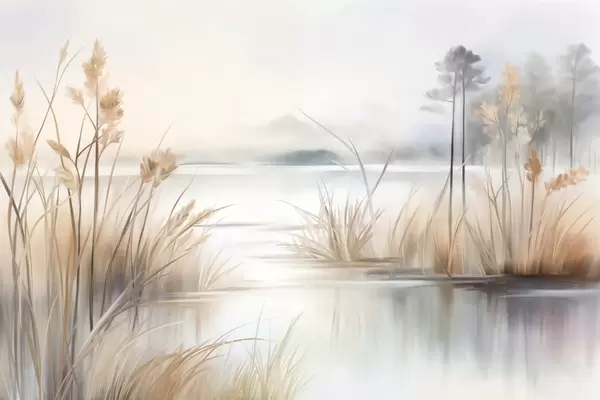 Fototapeten Landschaft mit einem See und hohem Gras im Vordergrund, Bergen im Hintergrund, sanften Farben, strukturiert N° w09534