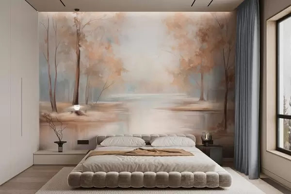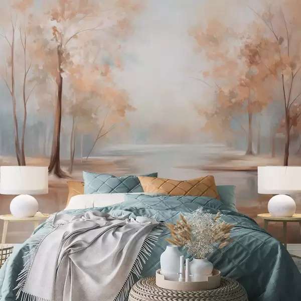 Fototapeten Herbstliche Landschaft mit Bäumen und einem Fluss, sanfte Farben, helle und luftige Atmosphäre, friedliche und ruhige Szene N° w09541