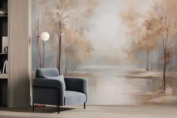 Fototapeten Herbstliche Landschaft mit Bäumen und einem Fluss, sanfte Farben, helle und luftige Atmosphäre, friedliche und ruhige Szene N° w09541