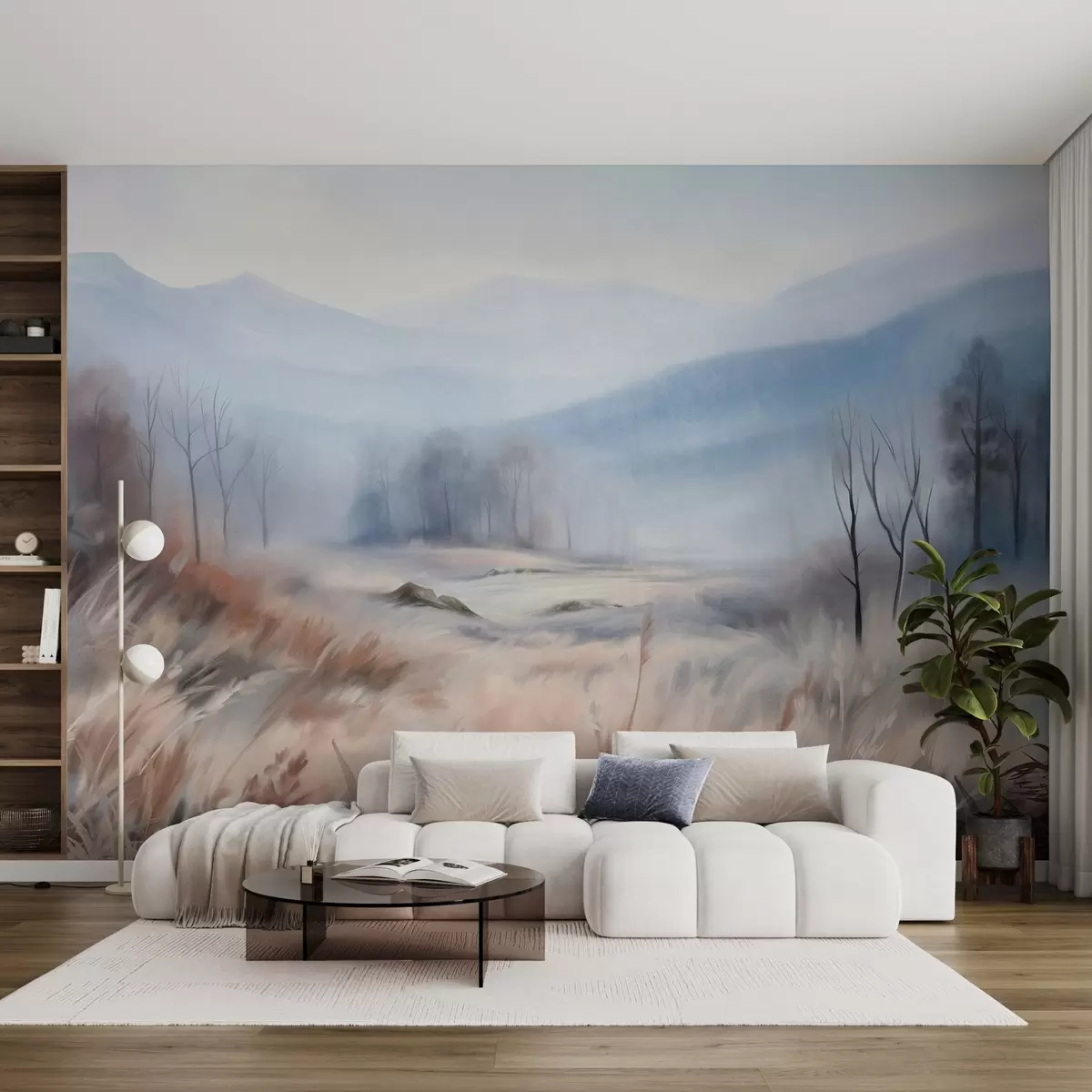 Fototapeten Strukturierte Landschaft mit trockenem Gras im Vordergrund und Bäumen im Hintergrund, mit Bergen in der Ferne N° w09542