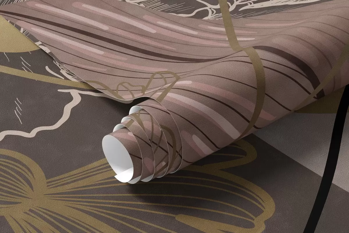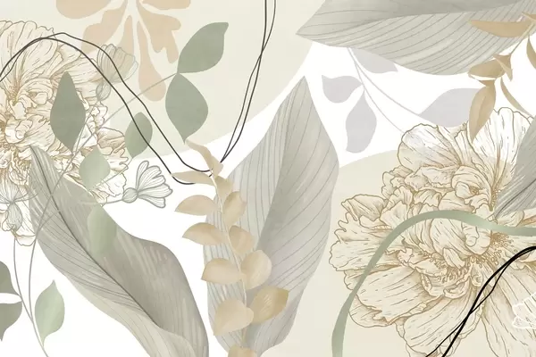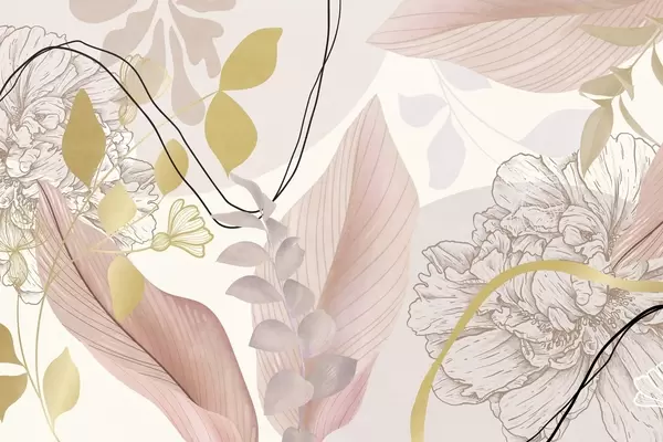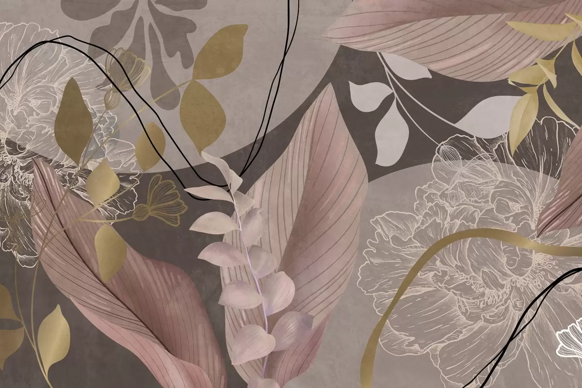 Fototapeten Abstrakter Blumendruck mit großen Blättern in gedeckten Rosa- und Brauntönen mit dünnen schwarzen Linien und weißen Blumenumrissen N° w09544