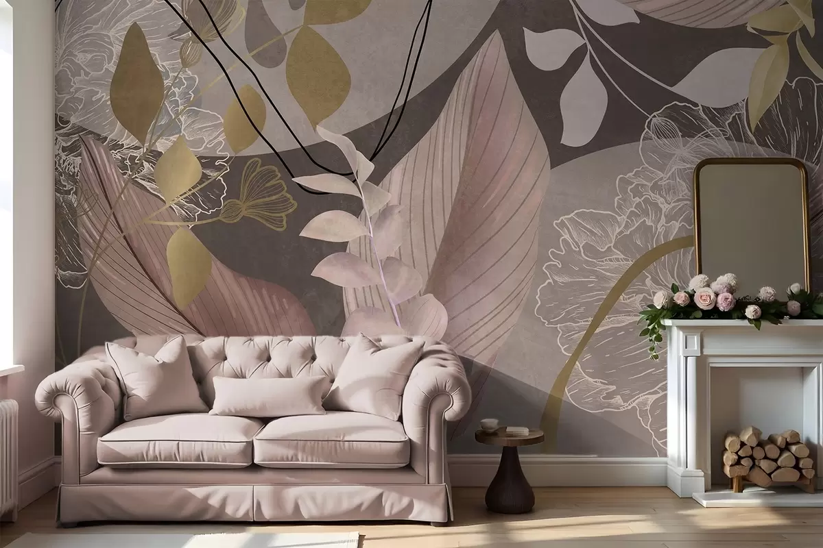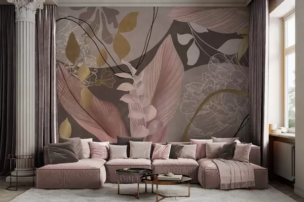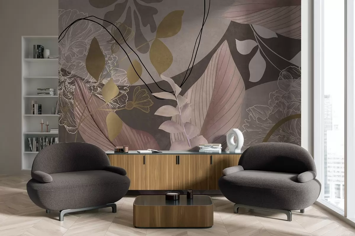 Fototapeten Abstrakter Blumendruck mit großen Blättern in gedeckten Rosa- und Brauntönen mit dünnen schwarzen Linien und weißen Blumenumrissen N° w09544