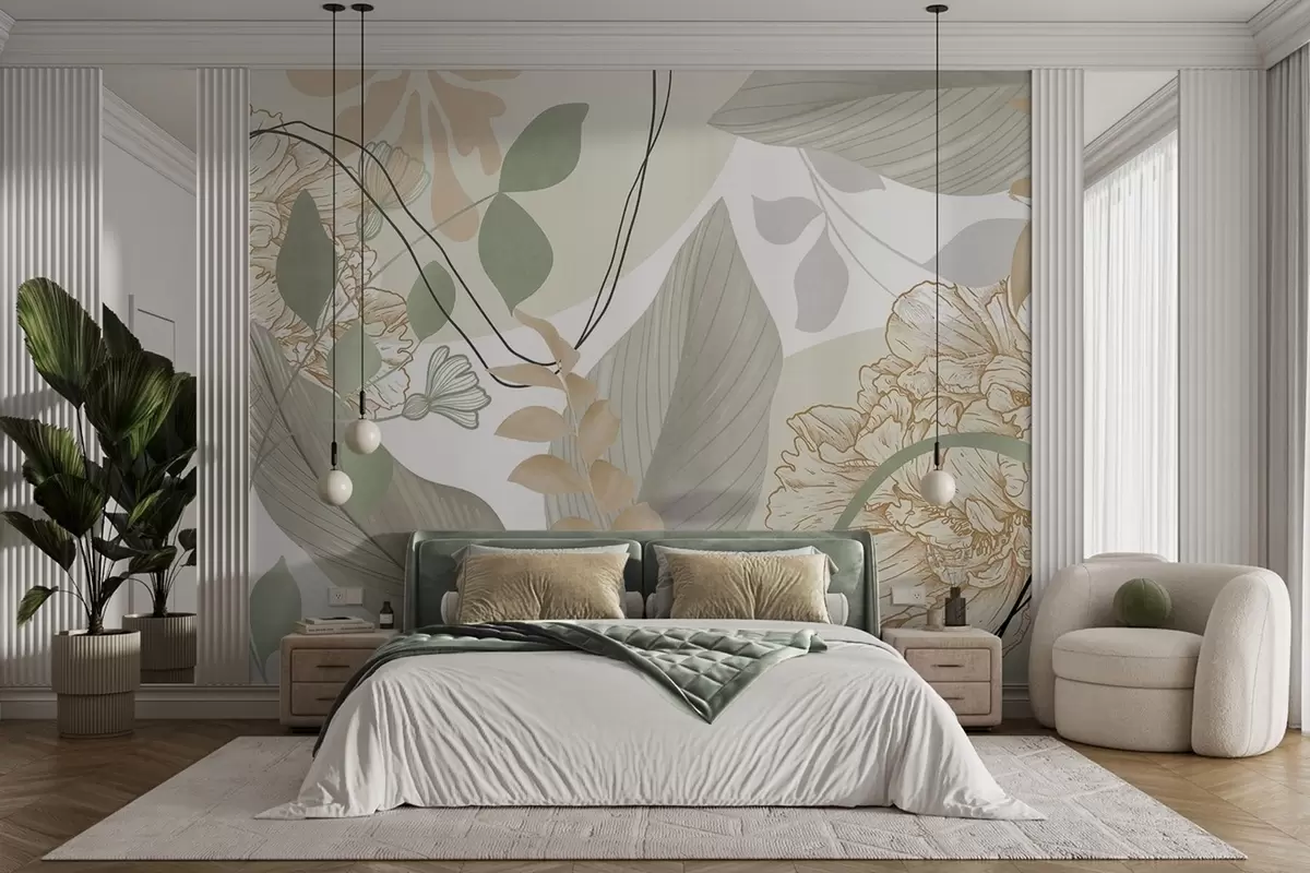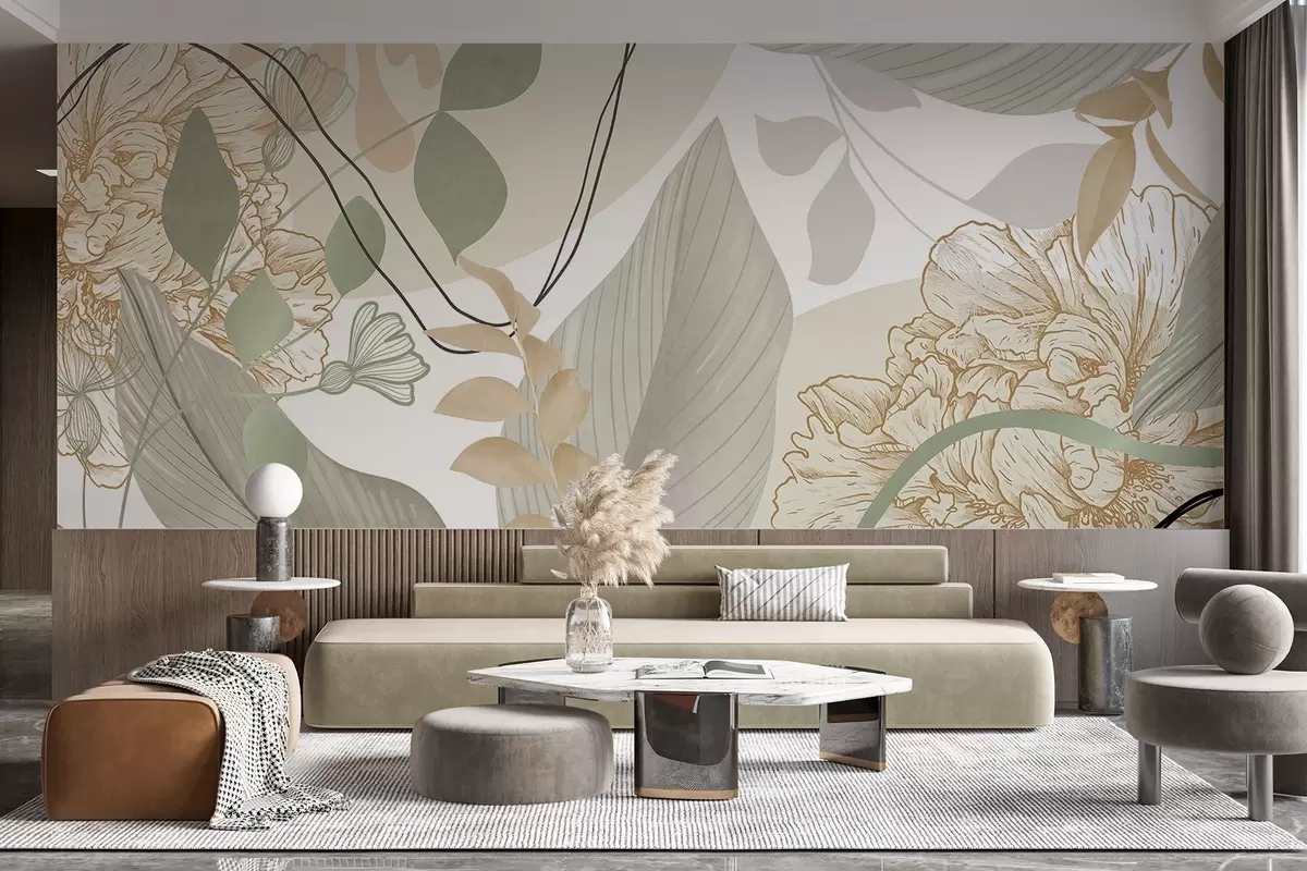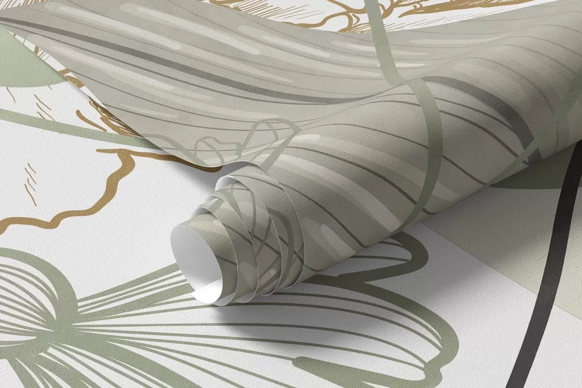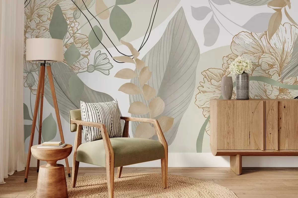 Fototapeten Abstrakter Blumendruck mit großen Blättern in gedeckten Grün- und Gelbtönen mit dünnen schwarzen Linien und weißen Blumenumrissen N° w09544v2