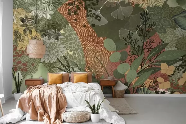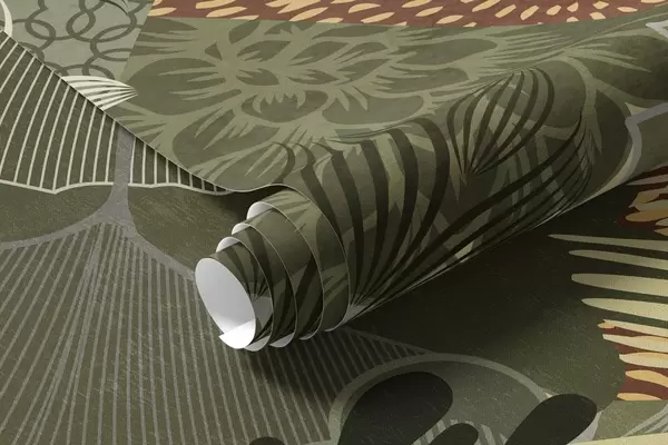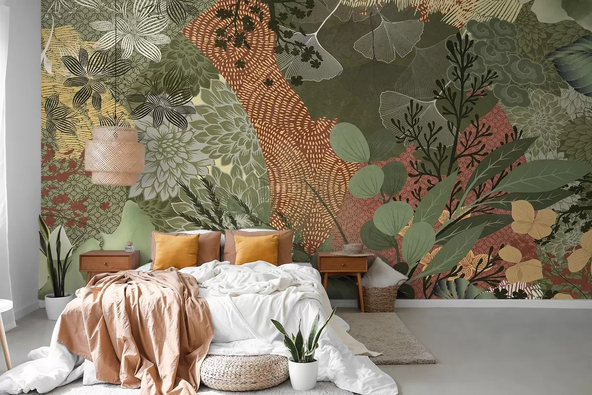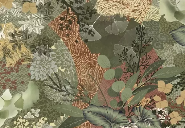 Fototapeten Abstrakte Collage mit botanischen Elementen wie Blättern, Blumen und organischen Texturen in Grün- und Brauntönen N° w09545