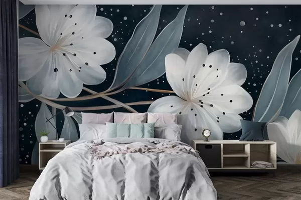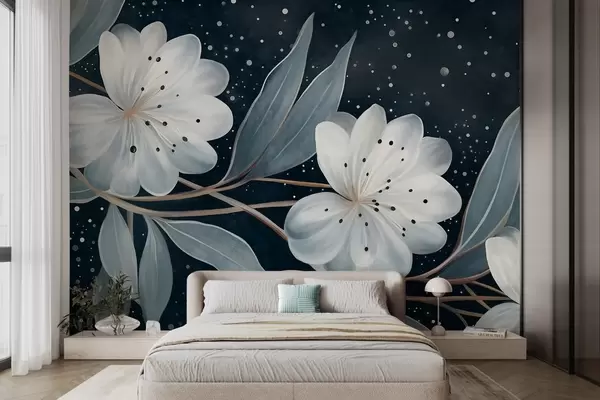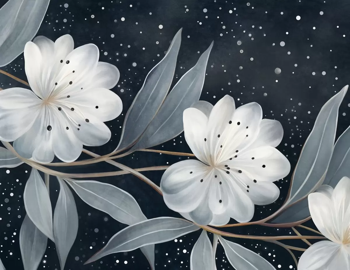 Fototapeten Fantasievolle weiße Blumen mit Struktur, umgeben von blaugrünen Blättern und Zweigen vor einem dunklen Hintergrund N° w09551