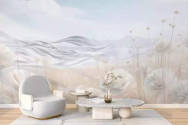 Fototapeten Strukturiertes Feld mit cremefarbenen Mohnblumen und sanften Hügeln unter einem hellblauen Himmel mit weichen Wolken, Pastellfarben N° w09553